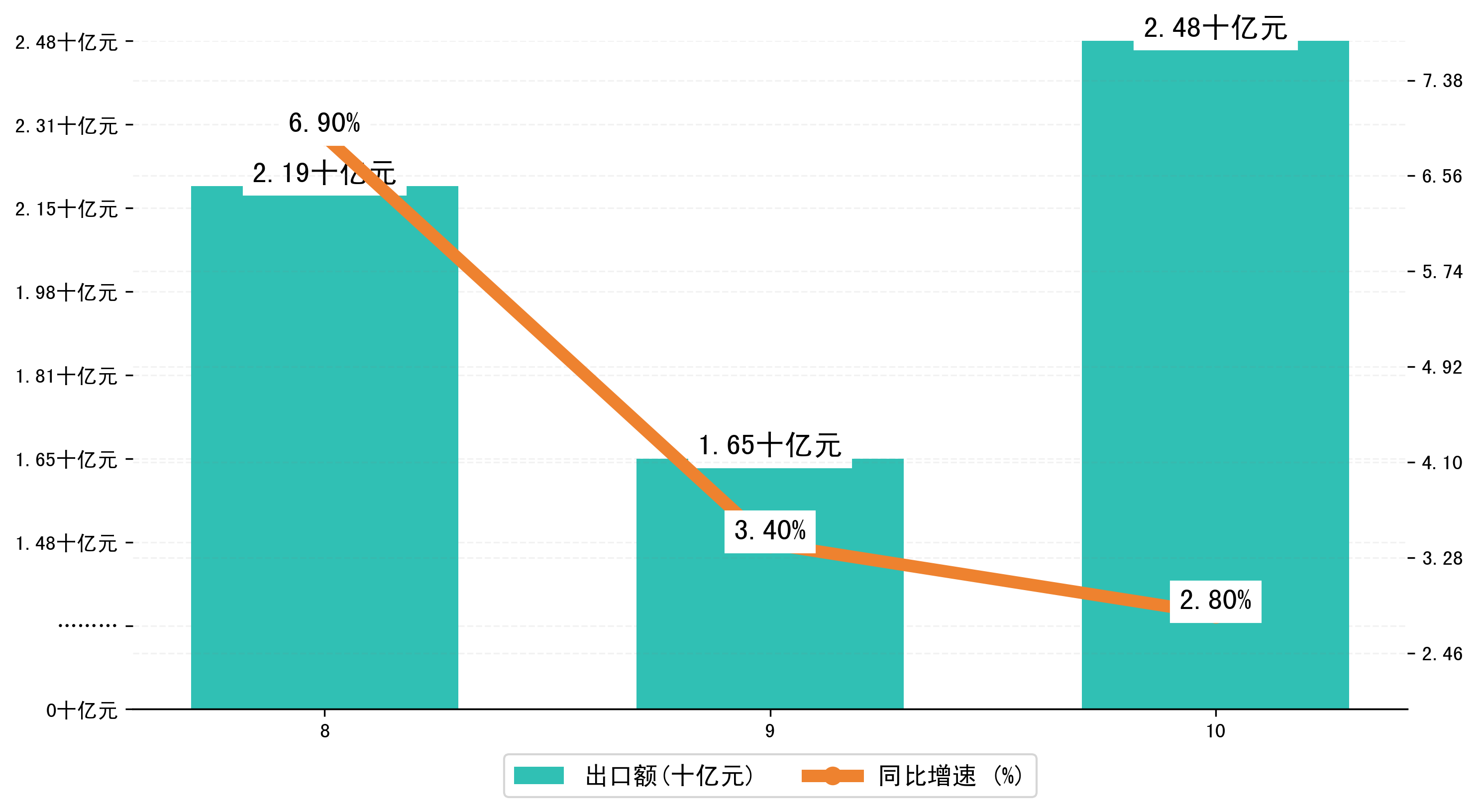 以人民币计,2024年1-10月安庆市出口额为229,9364.4071万元,相比上年同期增加了3,7867.9919万元,同比增加了2.80%。