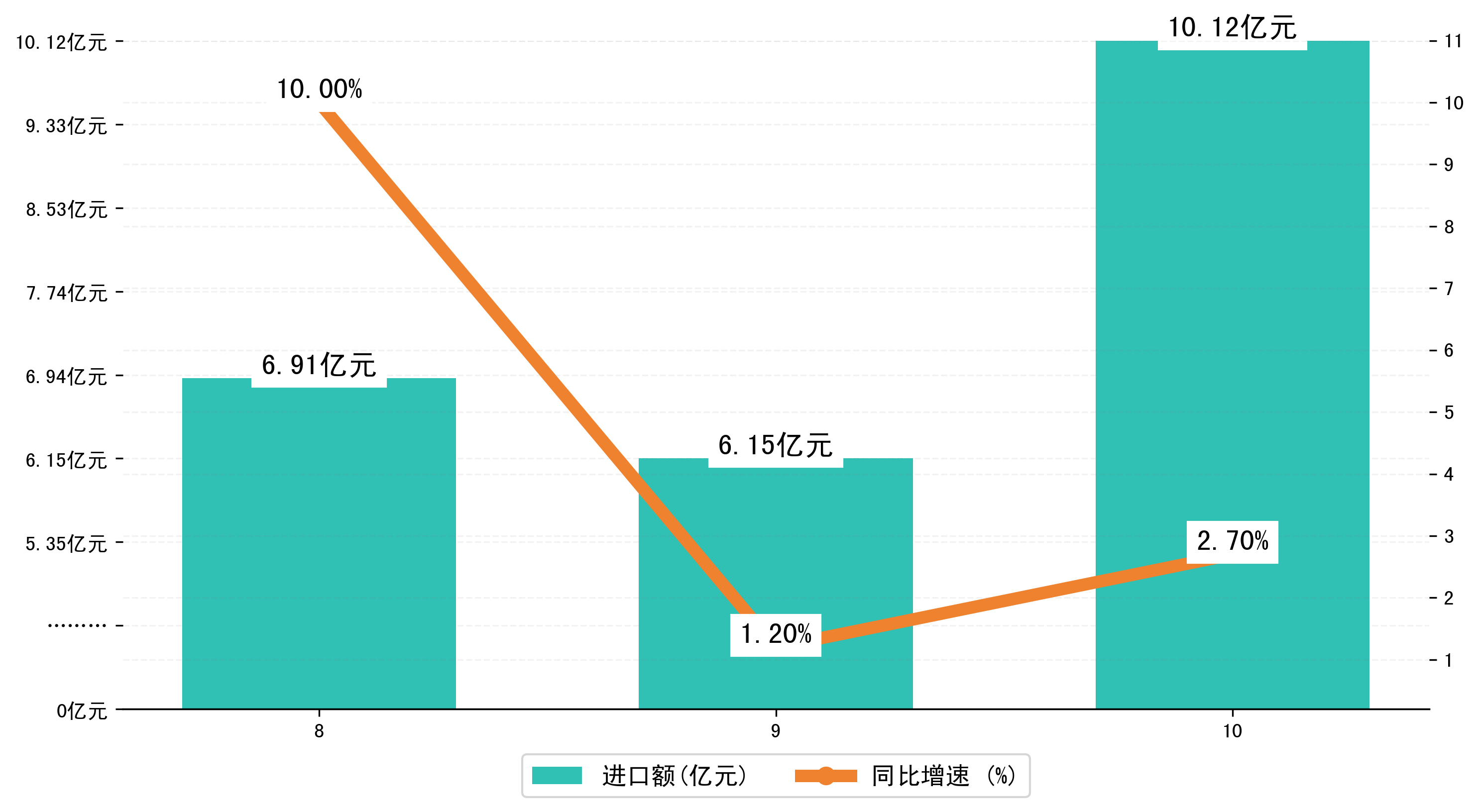 以人民币计,2024年10月安庆市进口额为10,1202.8924万元,相比上月增加了3,9748.4032万元;相比上年同期增加了1,1478.5989万元,同比增加了2.70%。