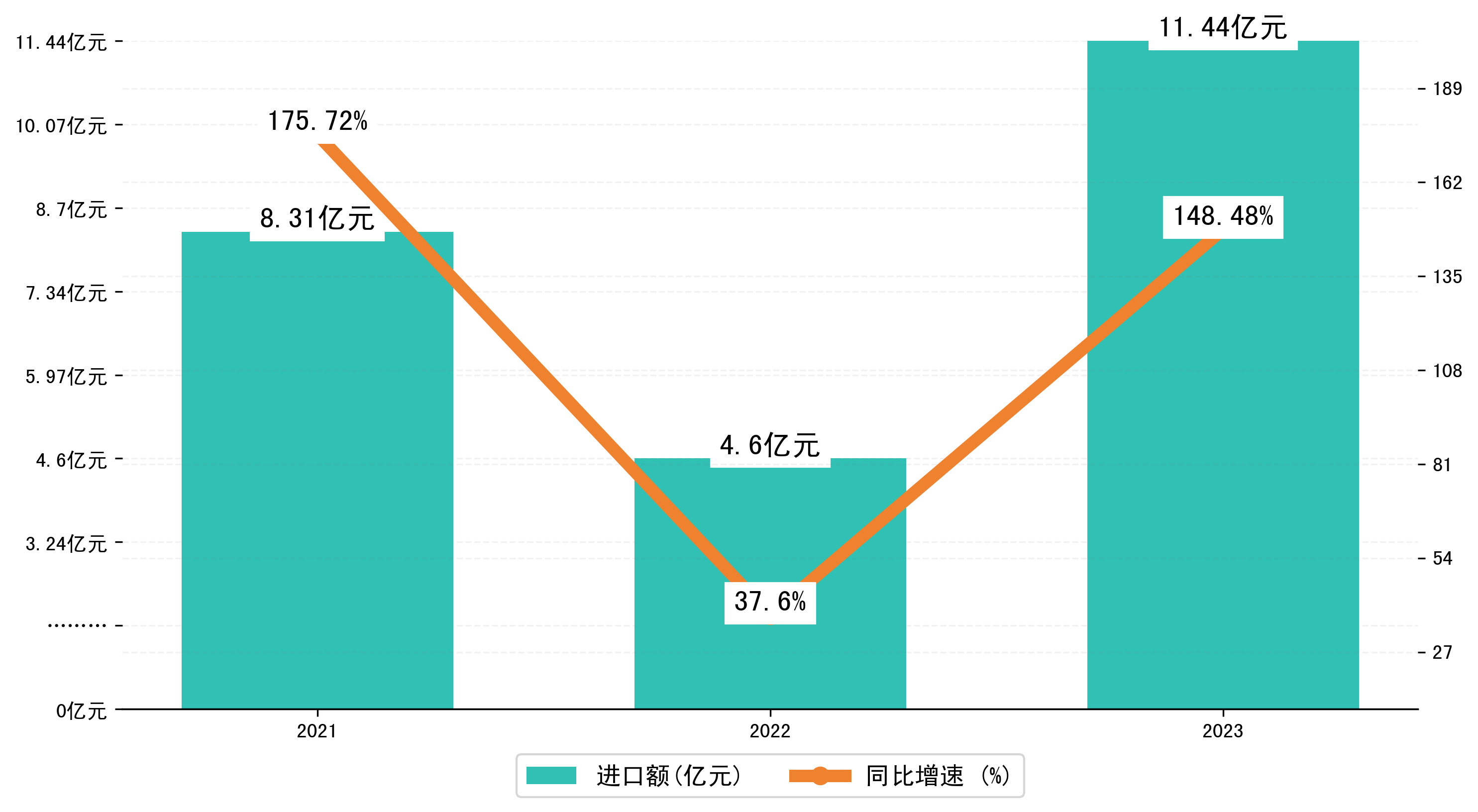 以美元计,2023年1-2月安庆市进口额为1,6541.0647万美元,相比上年同期增加了9325.8813万美元,同比增加129.80%。
