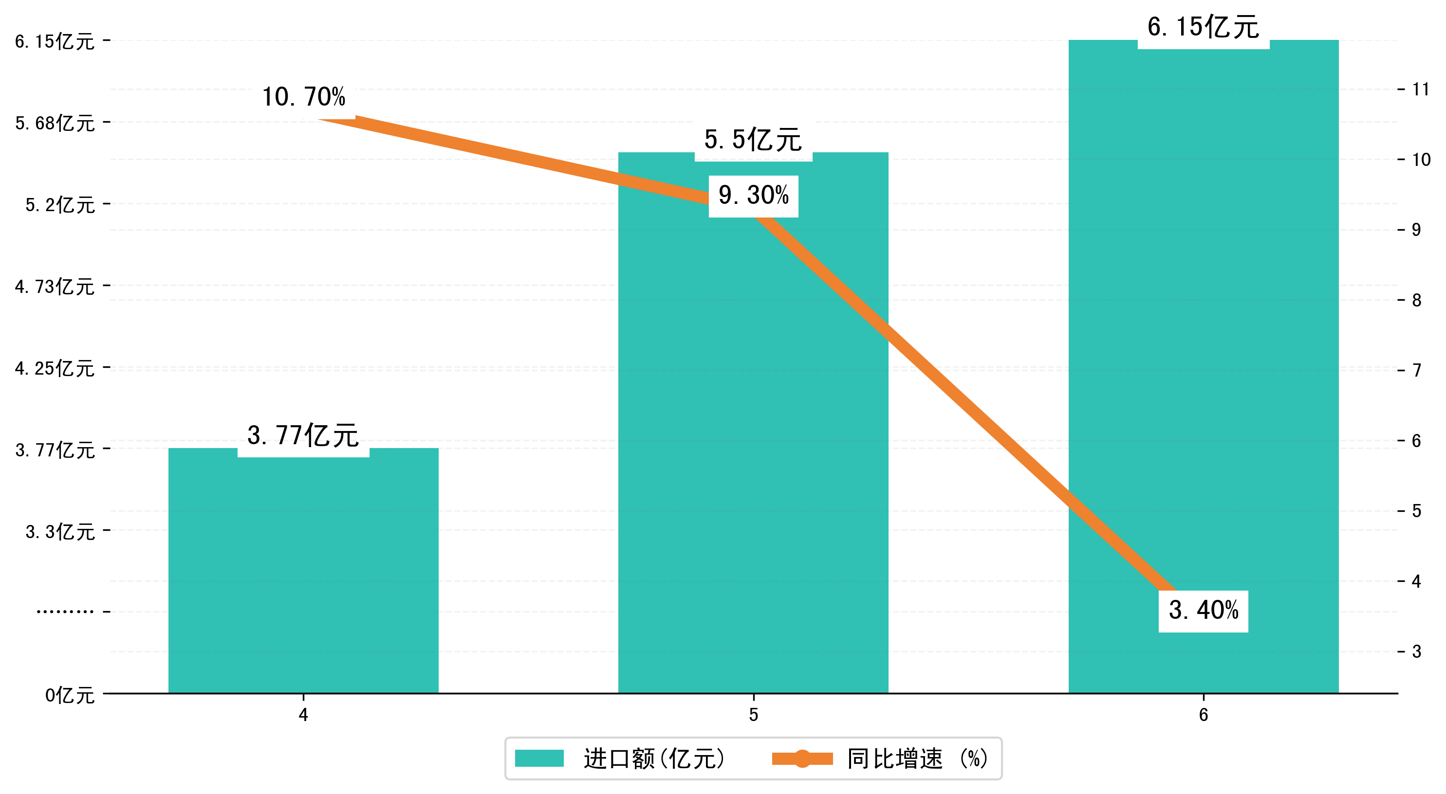 以美元计,2024年6月安庆市进口额为8657.3148万美元,相比上月增加了913.591万美元;相比上年同期减少了2364.0948万美元,同比增加0.80%。