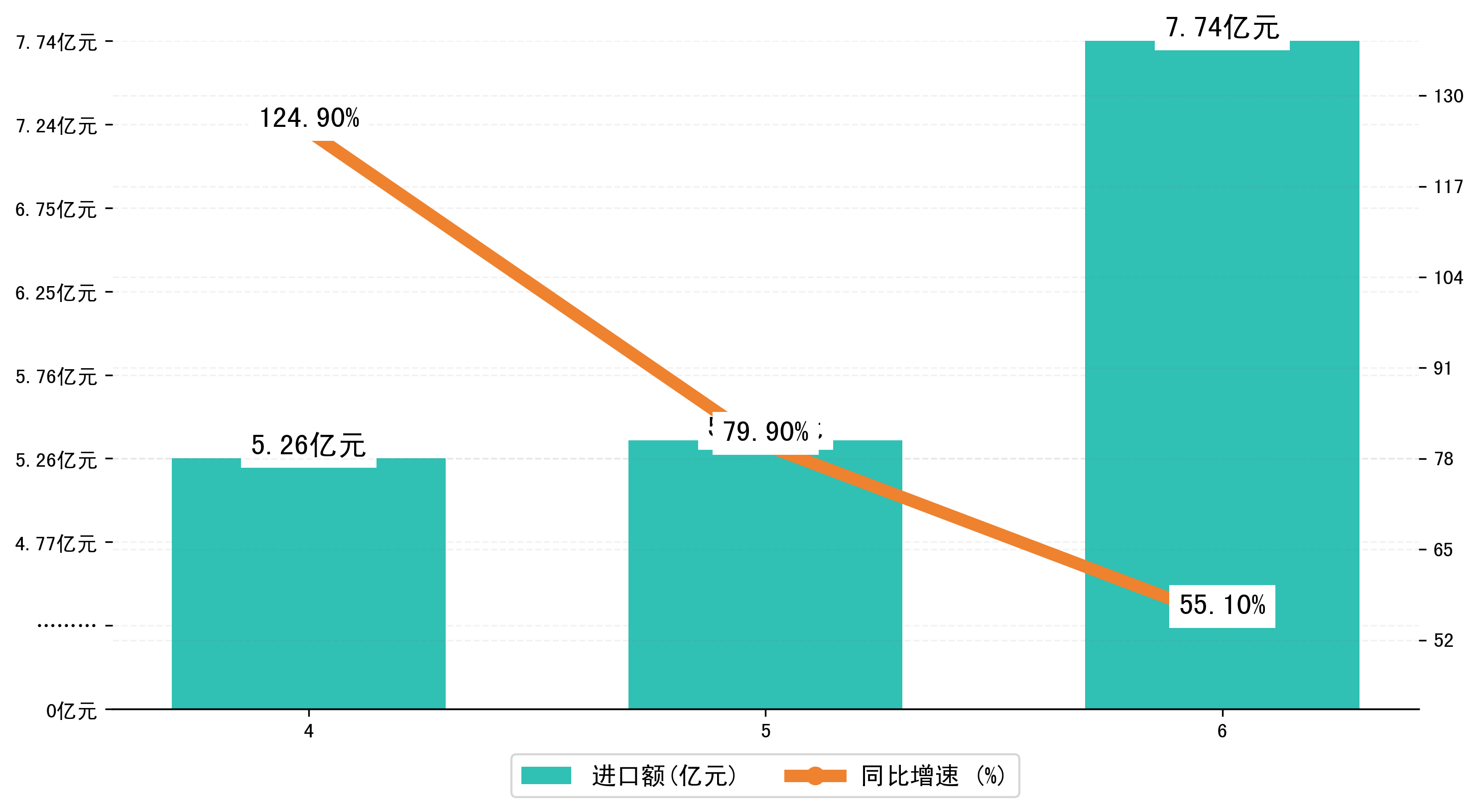 以美元计,2023年1-6月安庆市进口额为5,5462.8652万美元,相比上年同期增加了1,7234.9462万美元,同比增加45.20%。