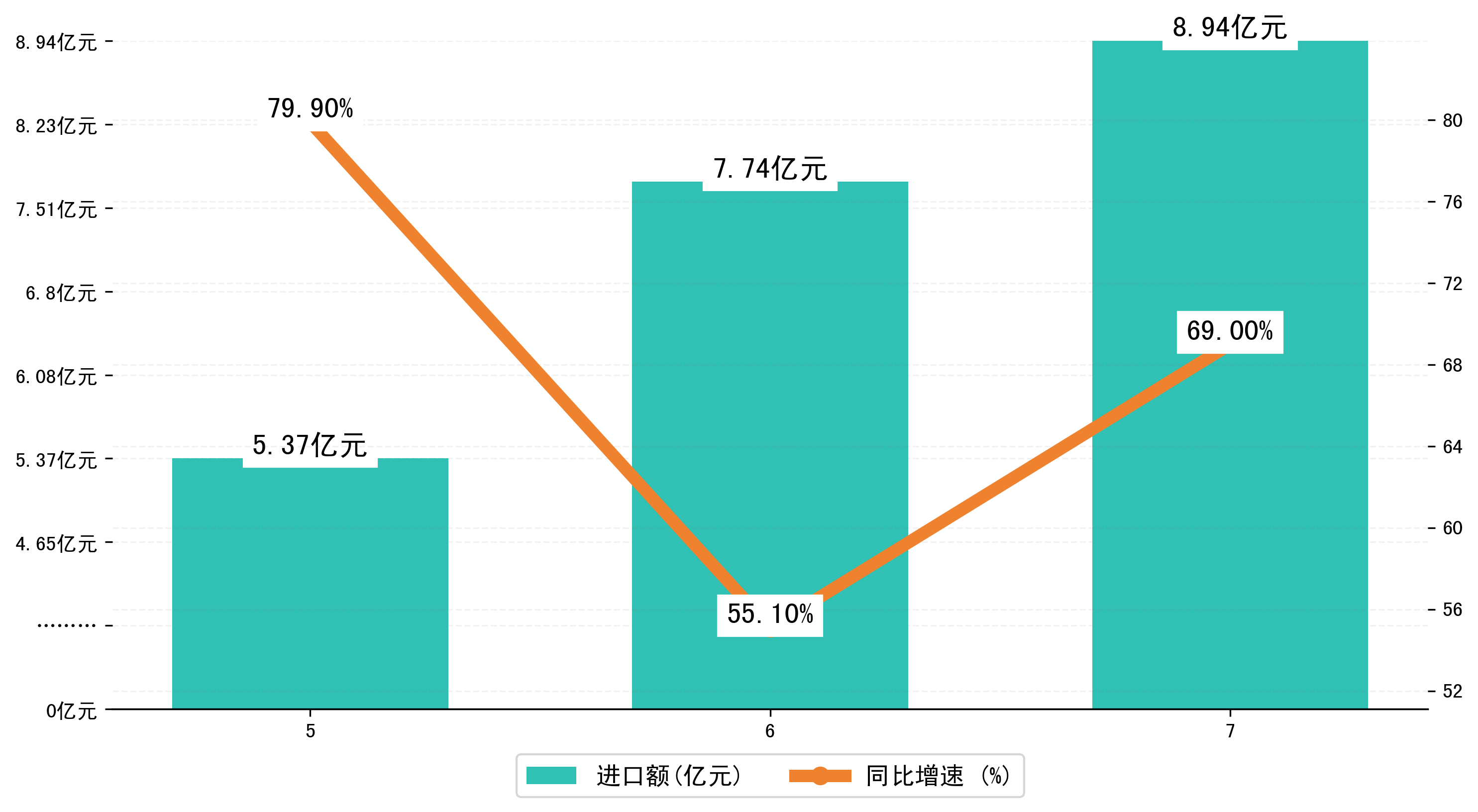 以人民币计,2023年7月安庆市进口额为8,9398.7539万元,相比上月增加了1,2046.8564万元;相比上年同期增加了5,7161.8731万元,同比增加了69.00%。