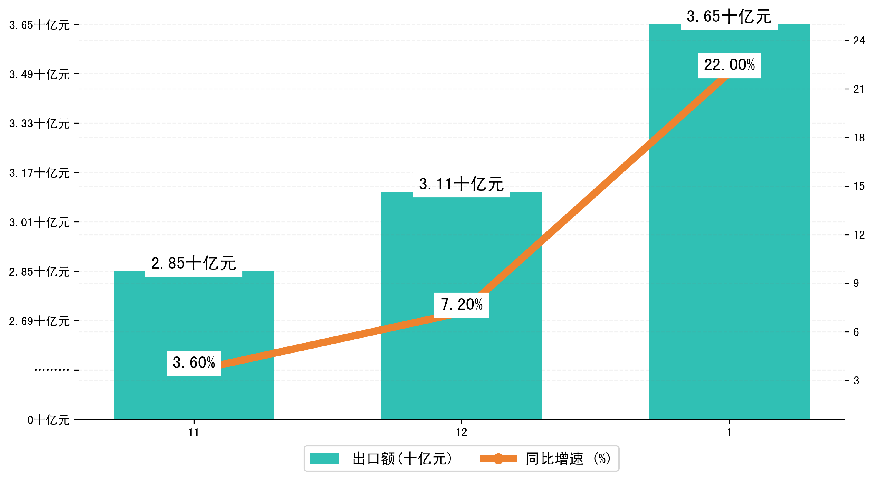 以美元计,2025年1-1月安庆市出口额为5,0822.5291万美元,相比上年同期增加了8633.3854万美元,同比增加20.40%。