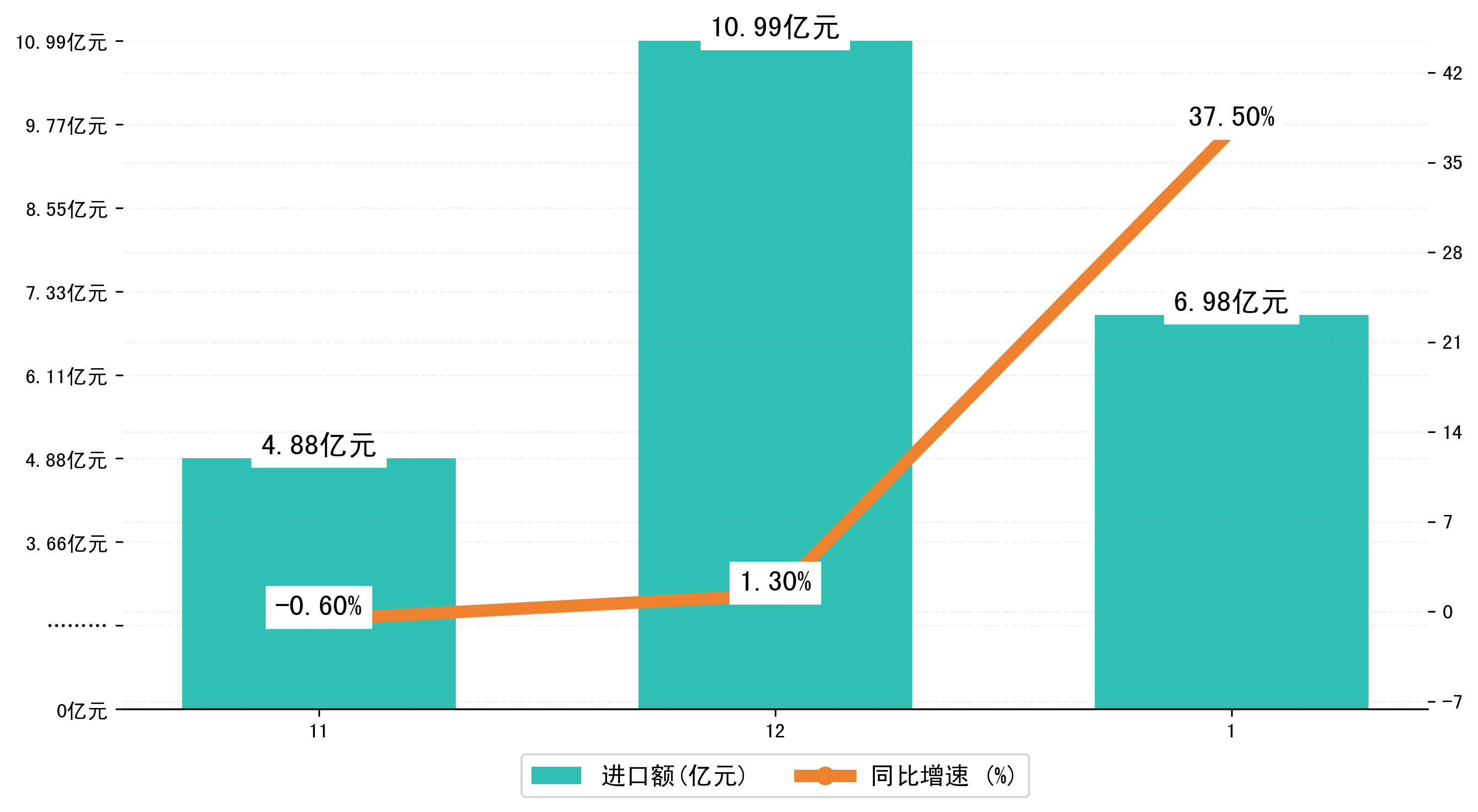 以美元计,2025年1-1月安庆市进口额为9707.5523万美元,相比上年同期增加了2540.8337万美元,同比增加35.50%。