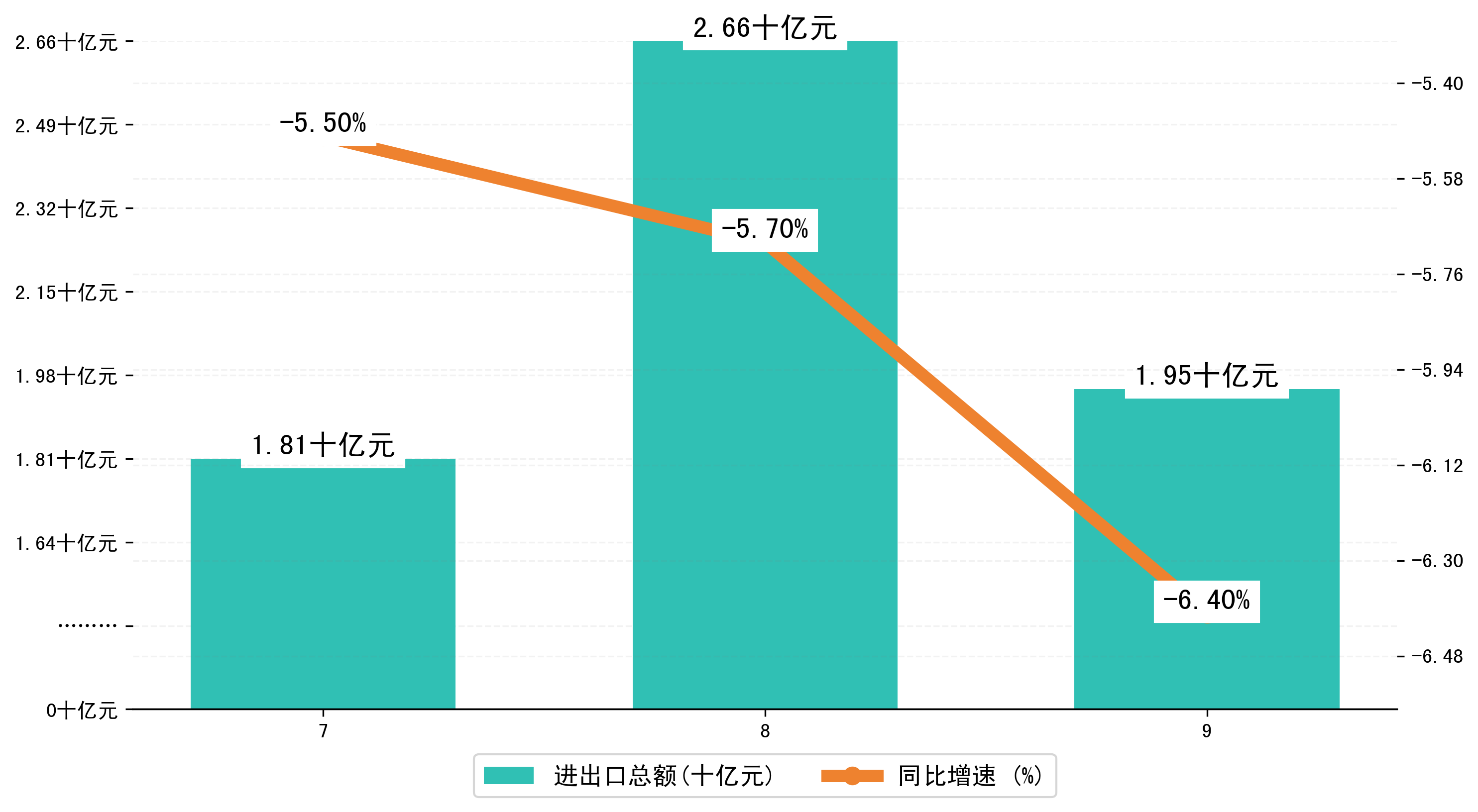 以人民币计,2025年1-9月安庆市进出口总额为251,2639.2544万元,相比上年同期减少了17,3507.8982万元,同比减少了-6.40%。