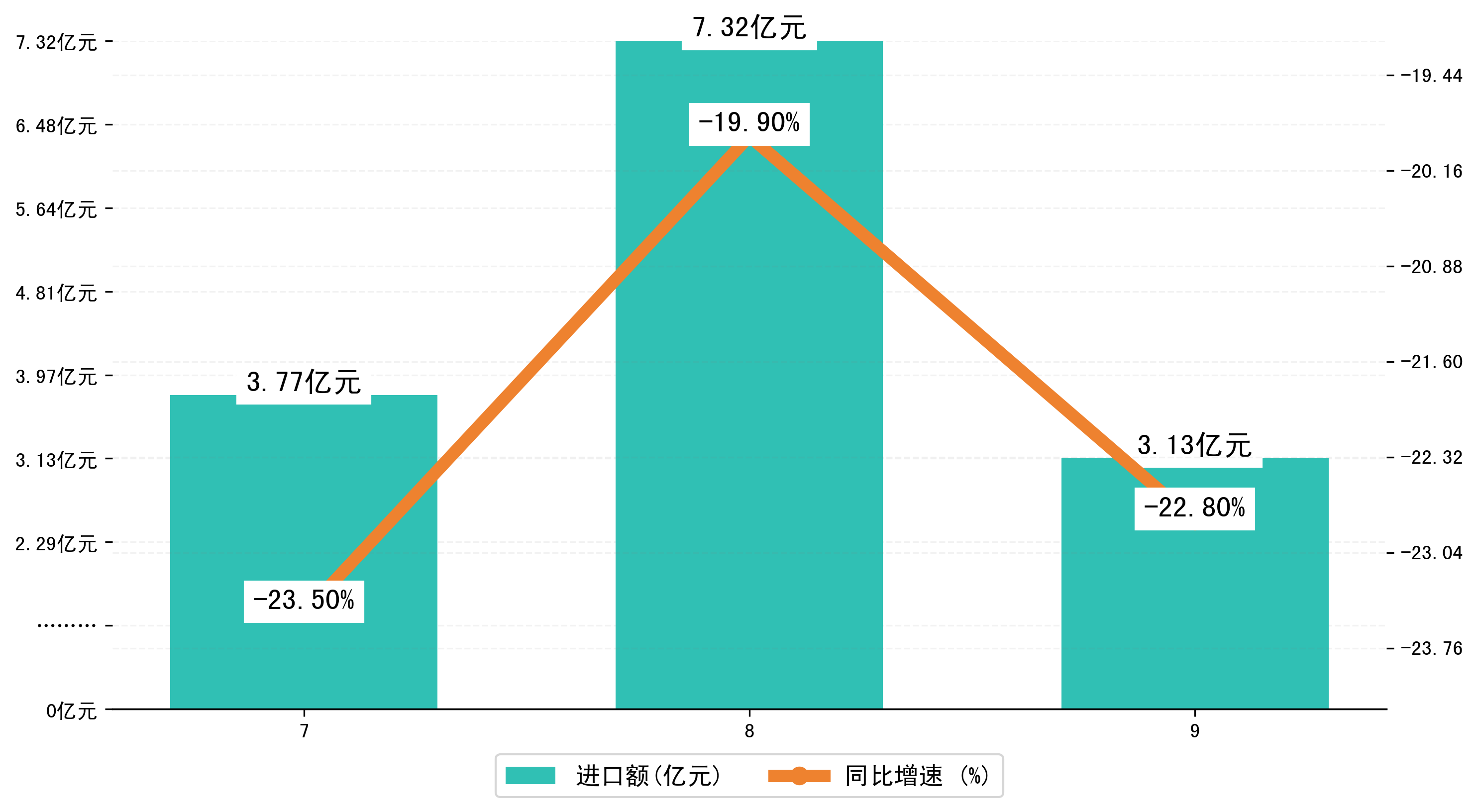 以人民币计,2025年1-9月安庆市进口额为49,0224.7576万元,相比上年同期减少了14,4321.5911万元,同比减少了-22.80%。
