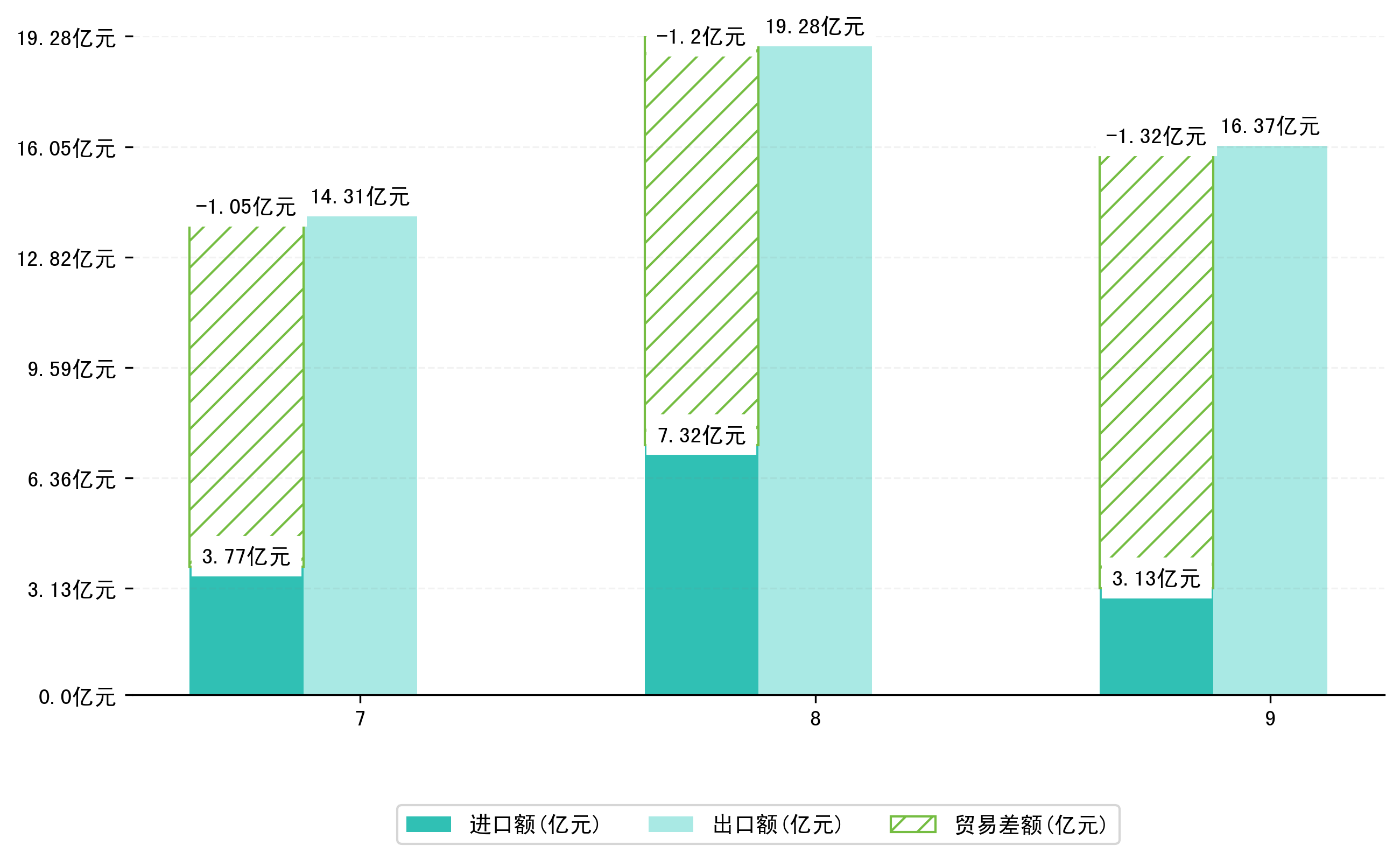 以人民币计,2025年9月安庆市贸易差额为13,2394,1817万元(贸易顺差),相比上月增加了1,2781,3023万元,即1846,2706万美元;相比上年同期增加了2,9196,9334万元,同比增加28.29%。