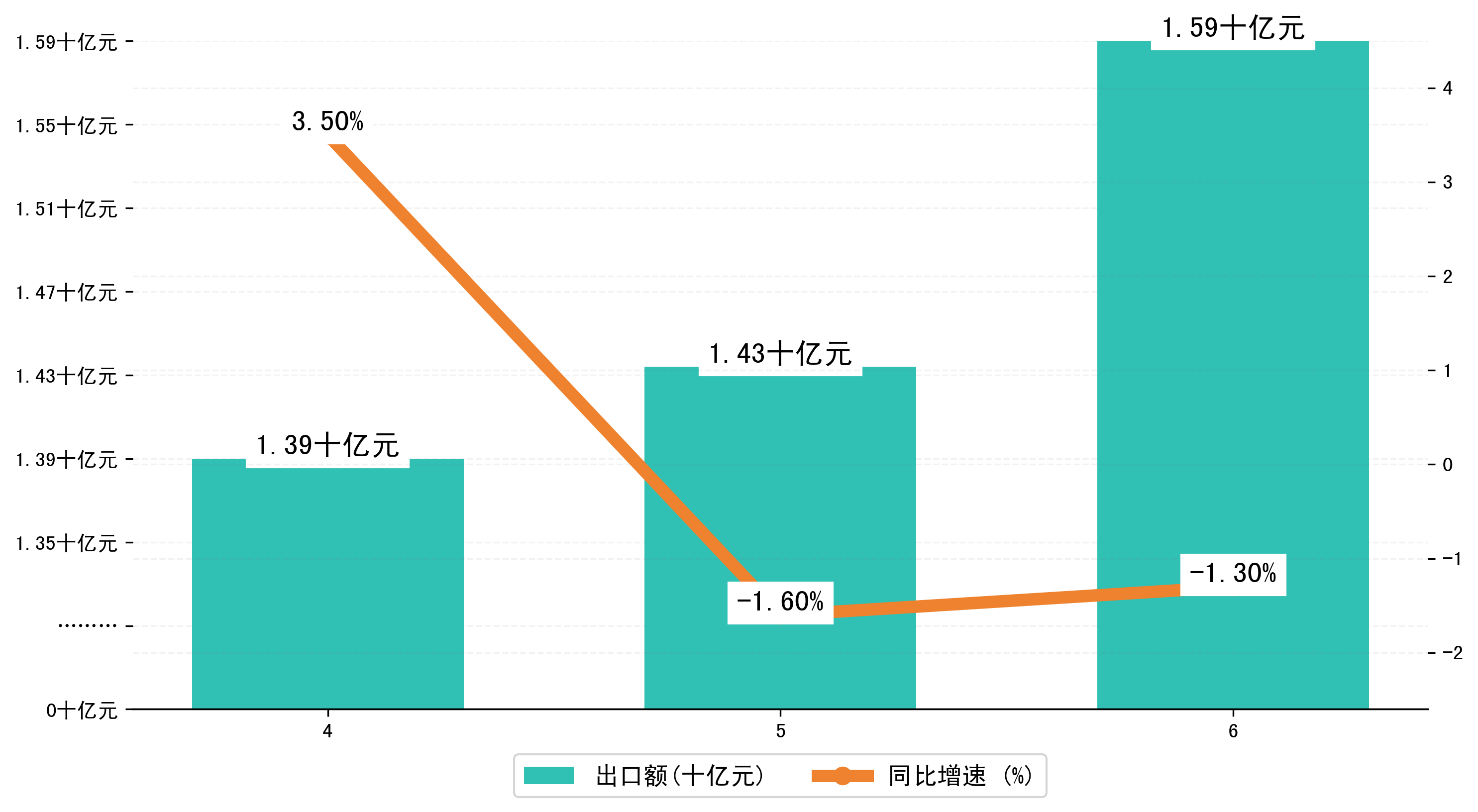 以人民币计,2024年6月鞍山市出口额为15,8906.1112万元,相比上月增加了1,5524.1566万元;相比上年同期增加了112.8796万元,同比减少了-1.30%。