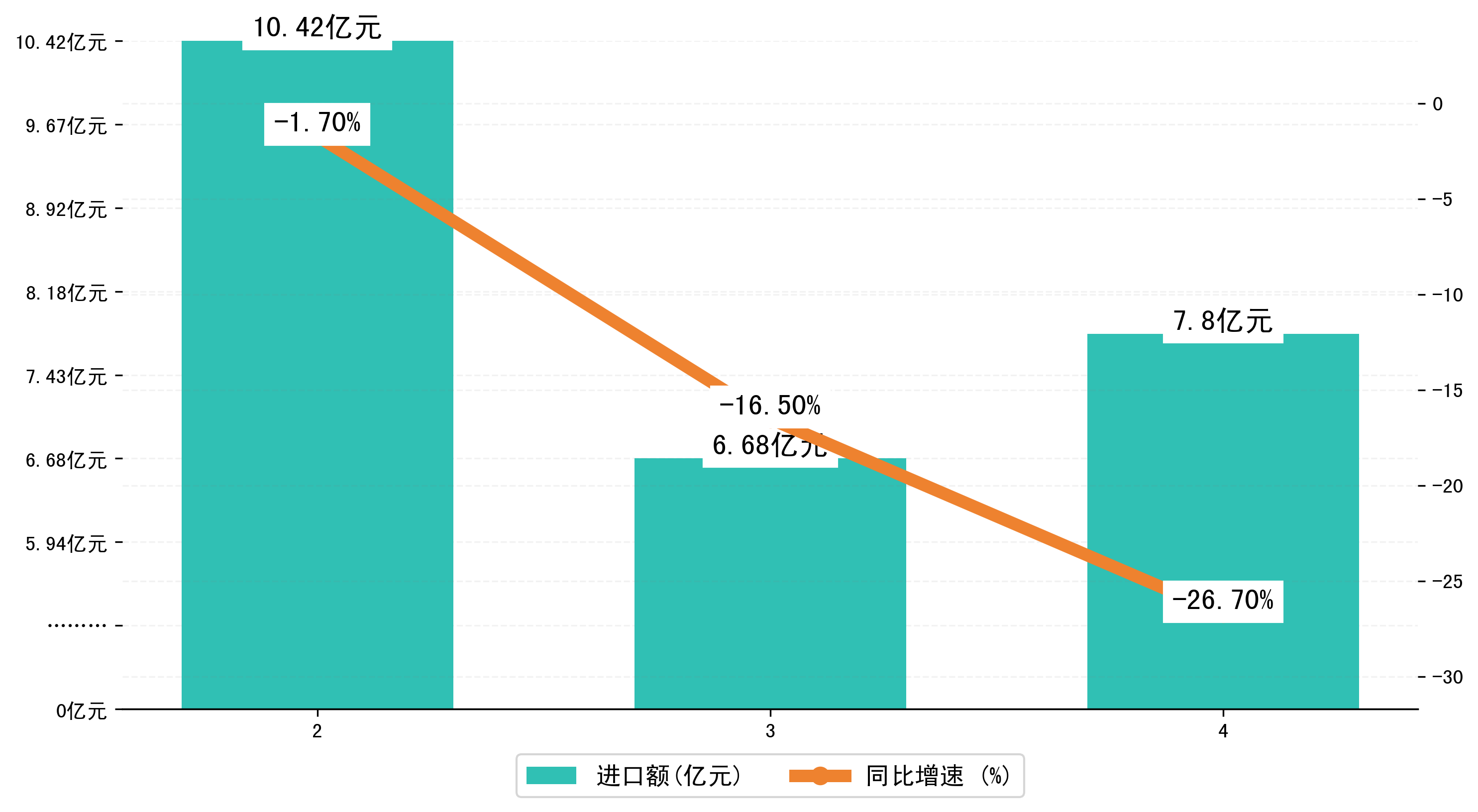 以人民币计,2024年1-4月鞍山市进口额为41,3860.1789万元,相比上年同期减少了10,2967.8231万元,同比减少了-26.70%。