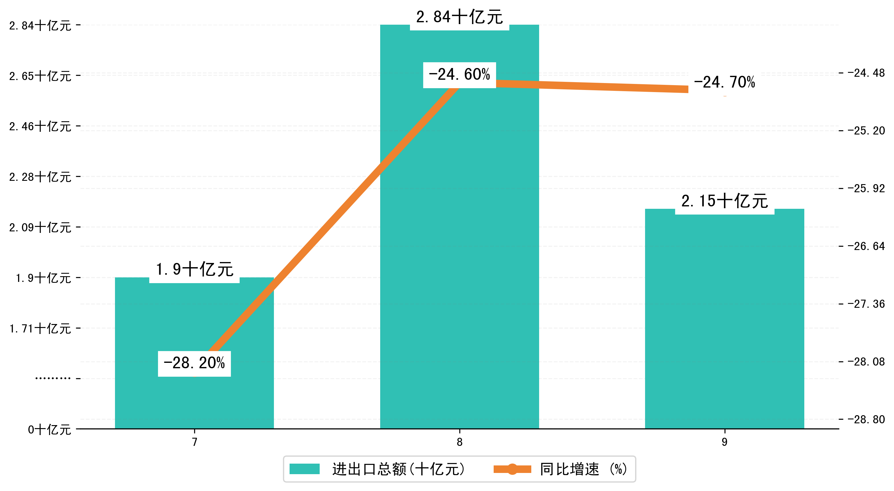 以人民币计,2023年9月鞍山市贸易差额为4,8269,9070万元(贸易顺差),相比上月增加了2,1151,9611万元,即2996,4777万美元;相比上年同期减少了2,4667,6457万元,同比减少-33.82%。