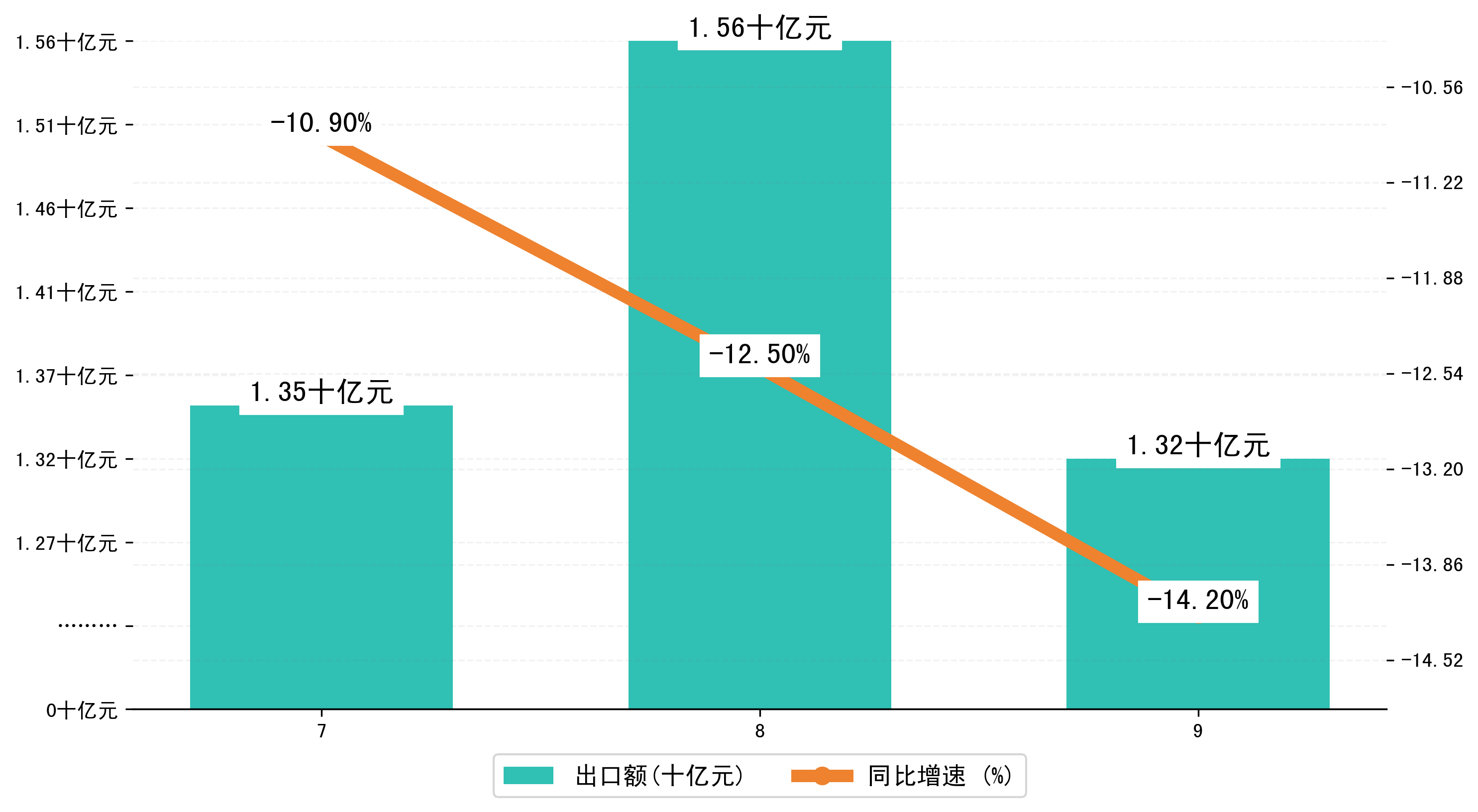 以人民币计,2023年1-9月鞍山市出口额为134,5734.1281万元,相比上年同期减少了22,2800.7913万元,同比减少了-14.20%。