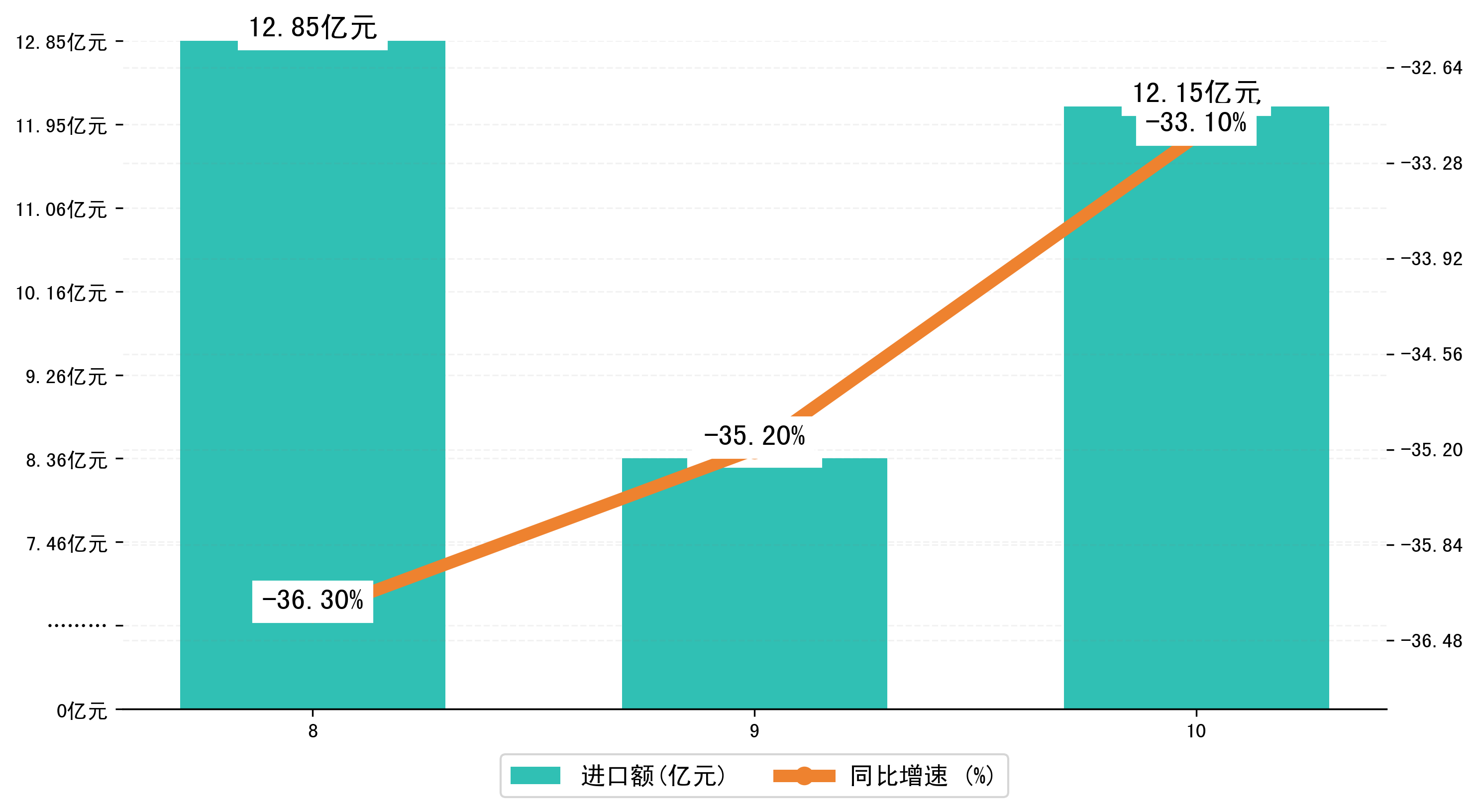 以人民币计,2023年10月鞍山市进口额为12,1451.3604万元,相比上月增加了3,7842.4419万元;相比上年同期减少了1,8513.55万元,同比减少了-33.10%。