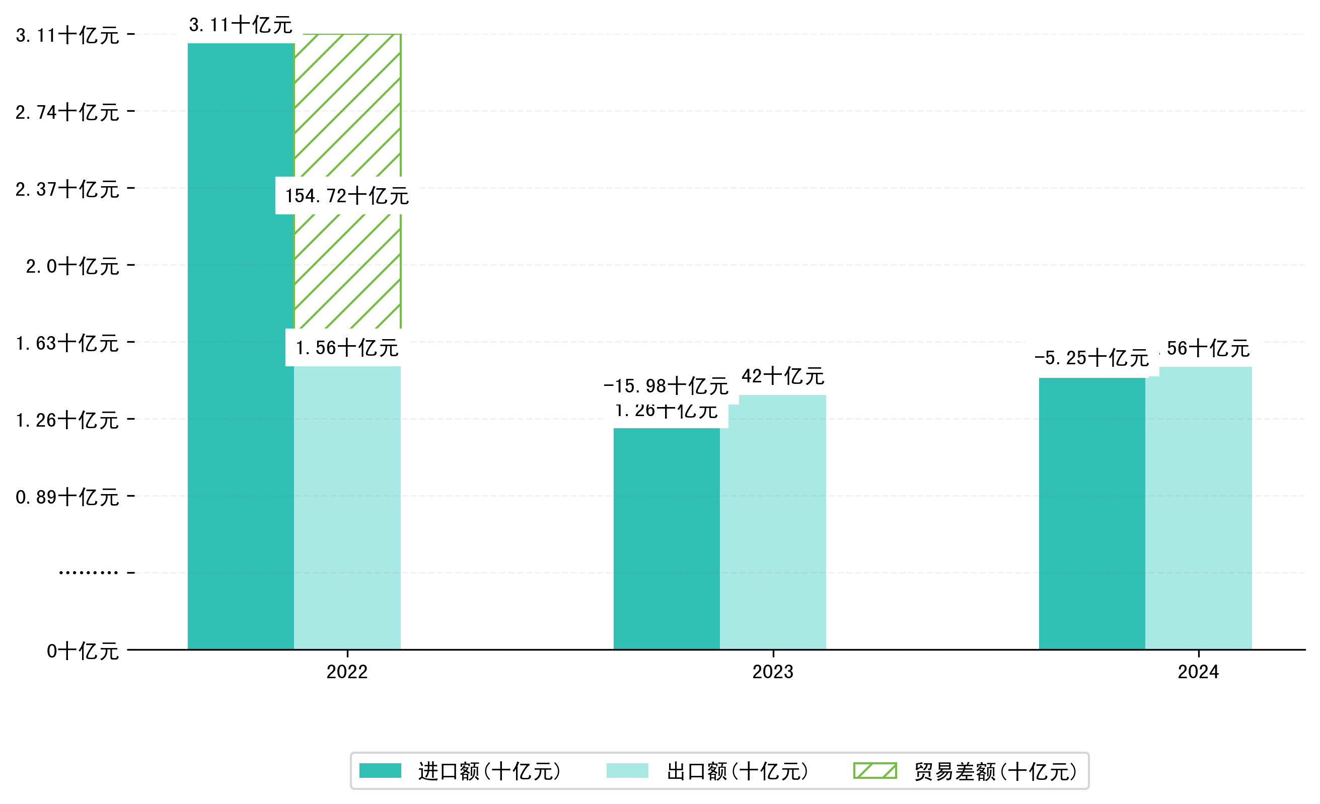 以人民币计,2024年1-1月鞍山市贸易差额为5246,1530万元(贸易顺差),相比上年同期减少了1,0732,8497万元,同比减少-67.17%。