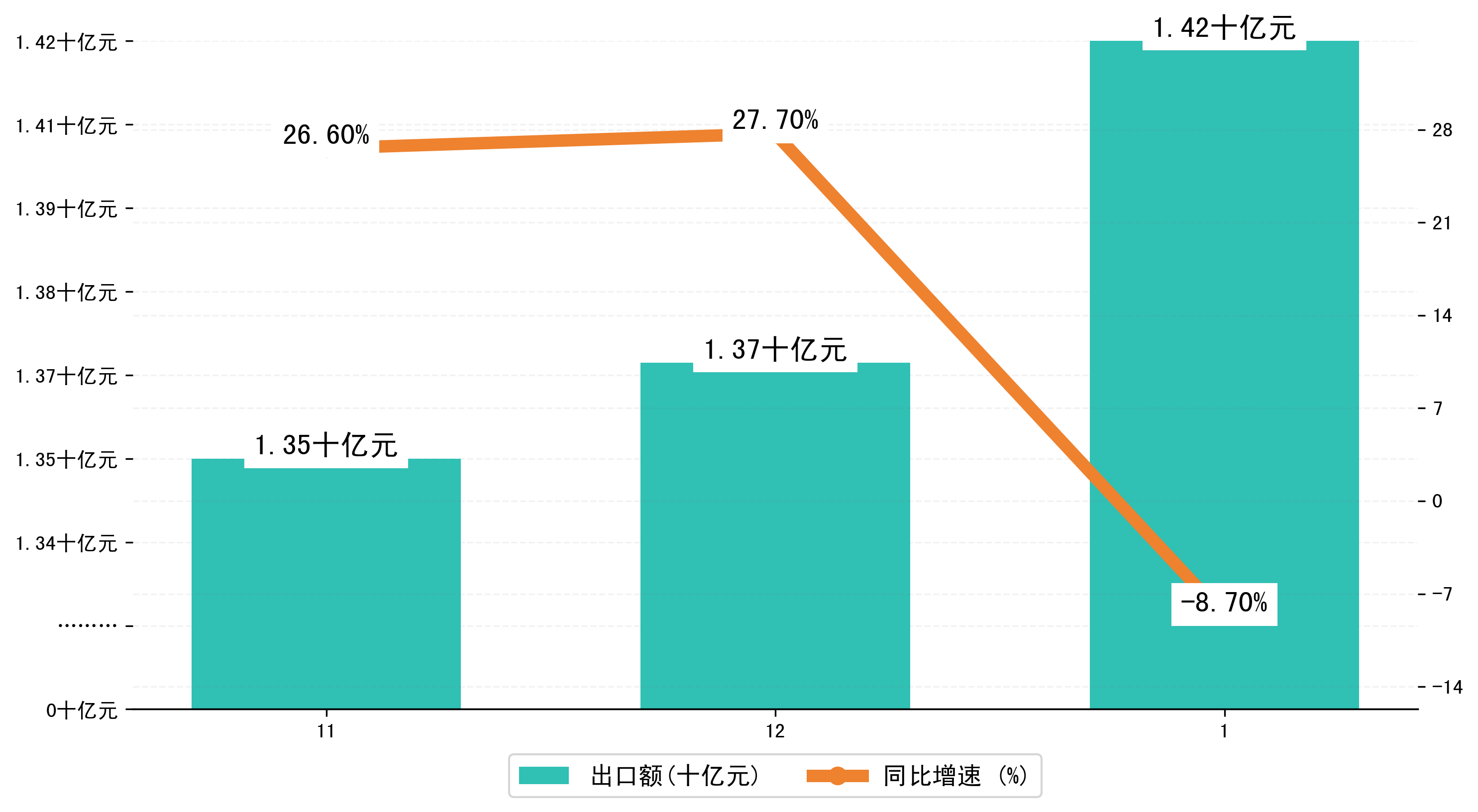 以人民币计,2023年1-1月鞍山市出口额为14,2278.6577万元,相比上年同期减少了1,3609.4042万元,同比减少了-8.70%。