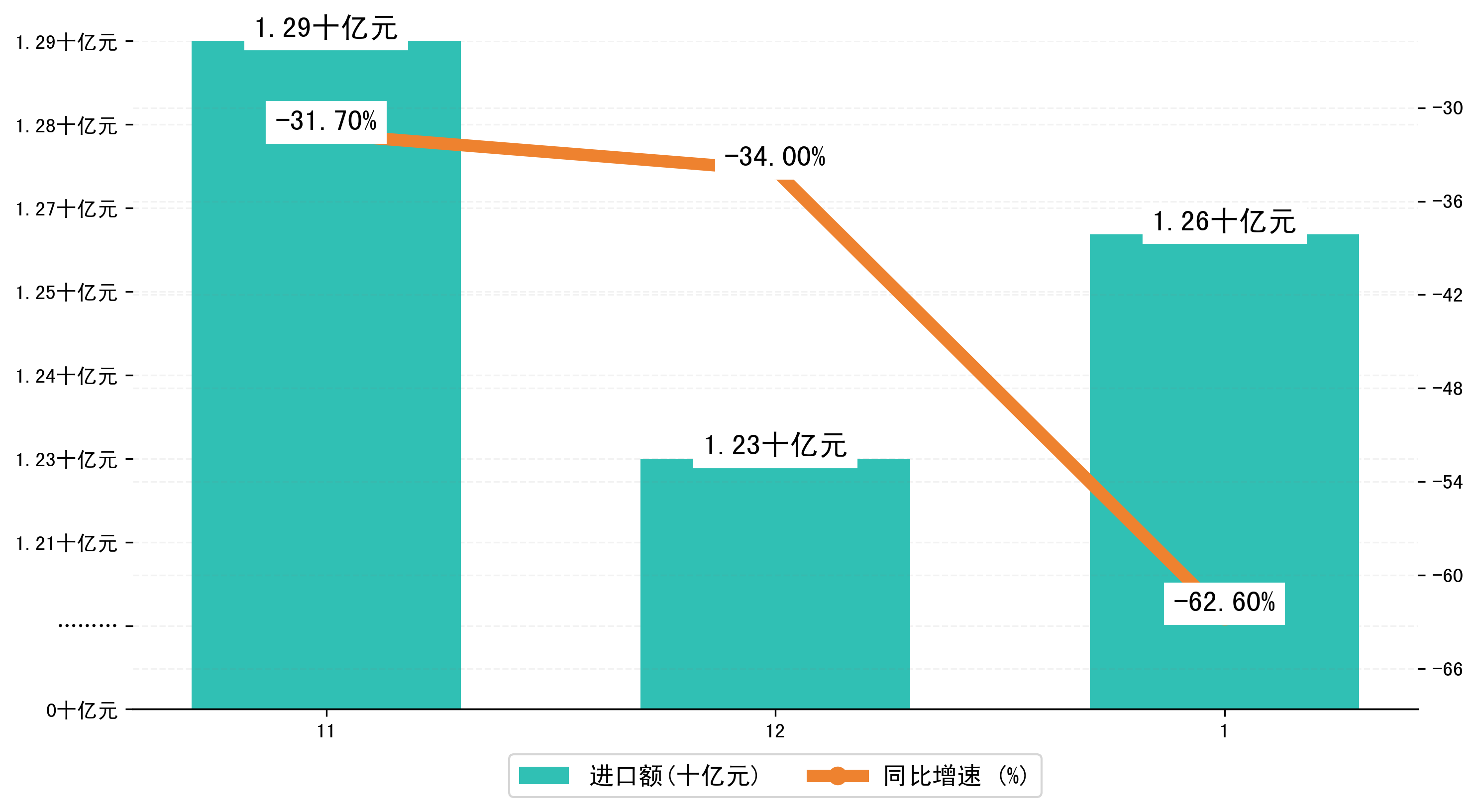 以美元计,2023年1-1月鞍山市进口额为1,8035.9007万美元,相比上年同期减少了3,0647.3915万美元,同比减少-65.90%。