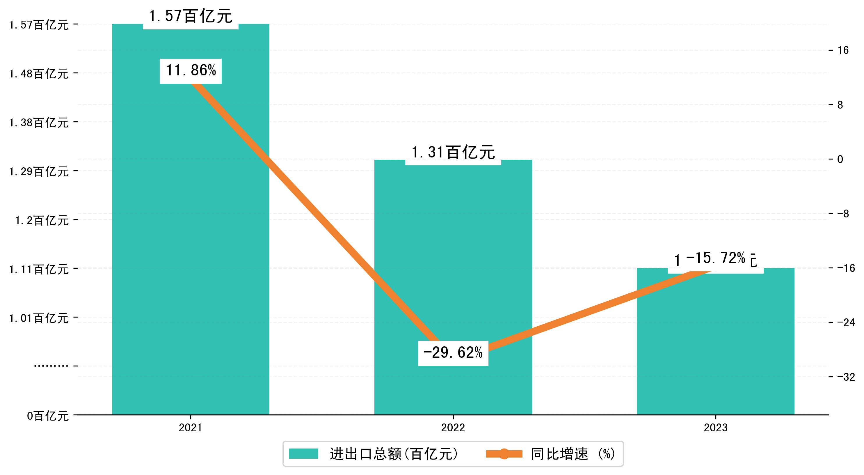 以人民币计,2023年1-4月鞍山市进出口总额为110,5723.2967万元,相比上年同期减少了20,6259.275万元,同比减少了-23.10%。