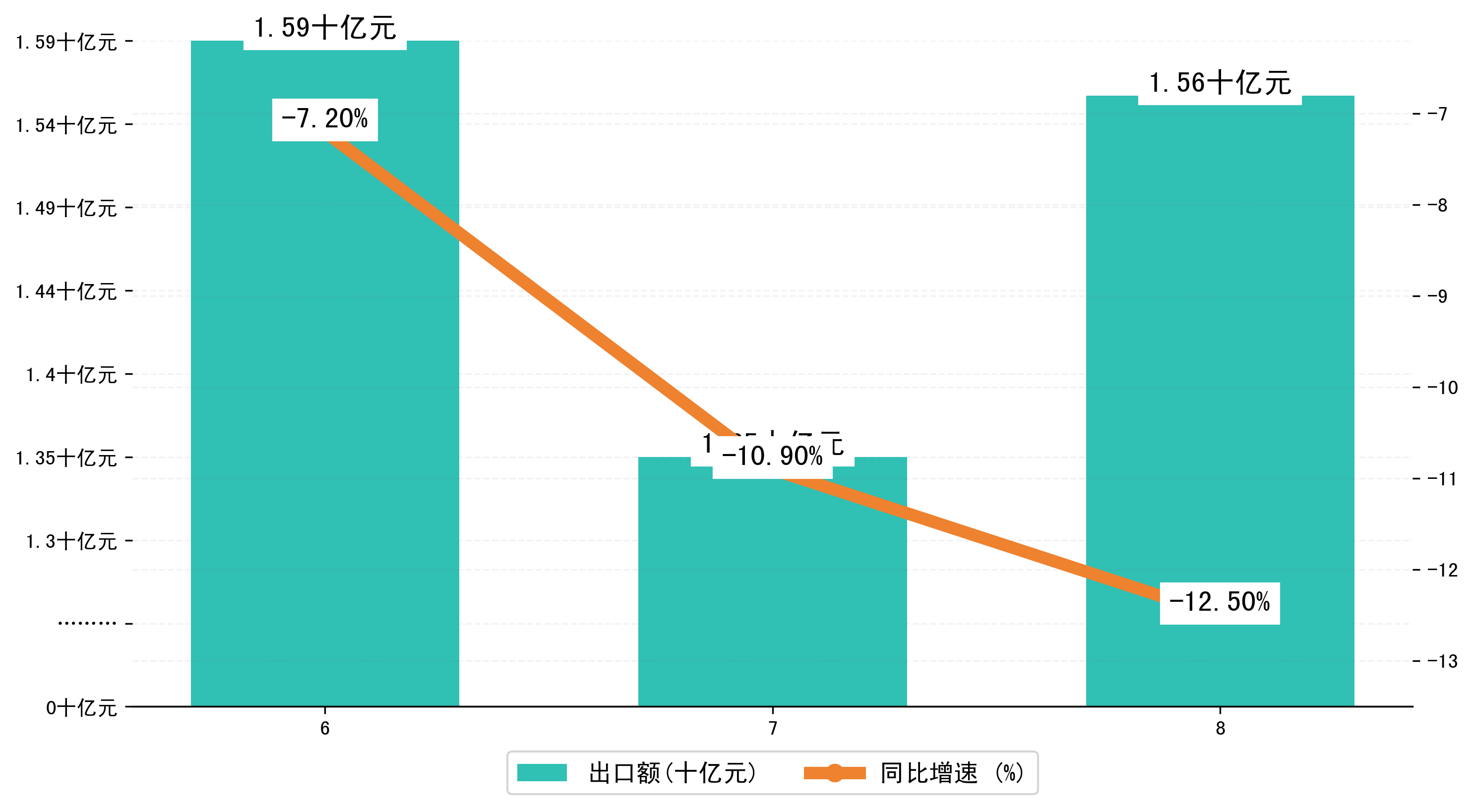 以人民币计,2023年1-8月鞍山市出口额为121,3855.3026万元,相比上年同期减少了17,2491.1648万元,同比减少了-12.50%。