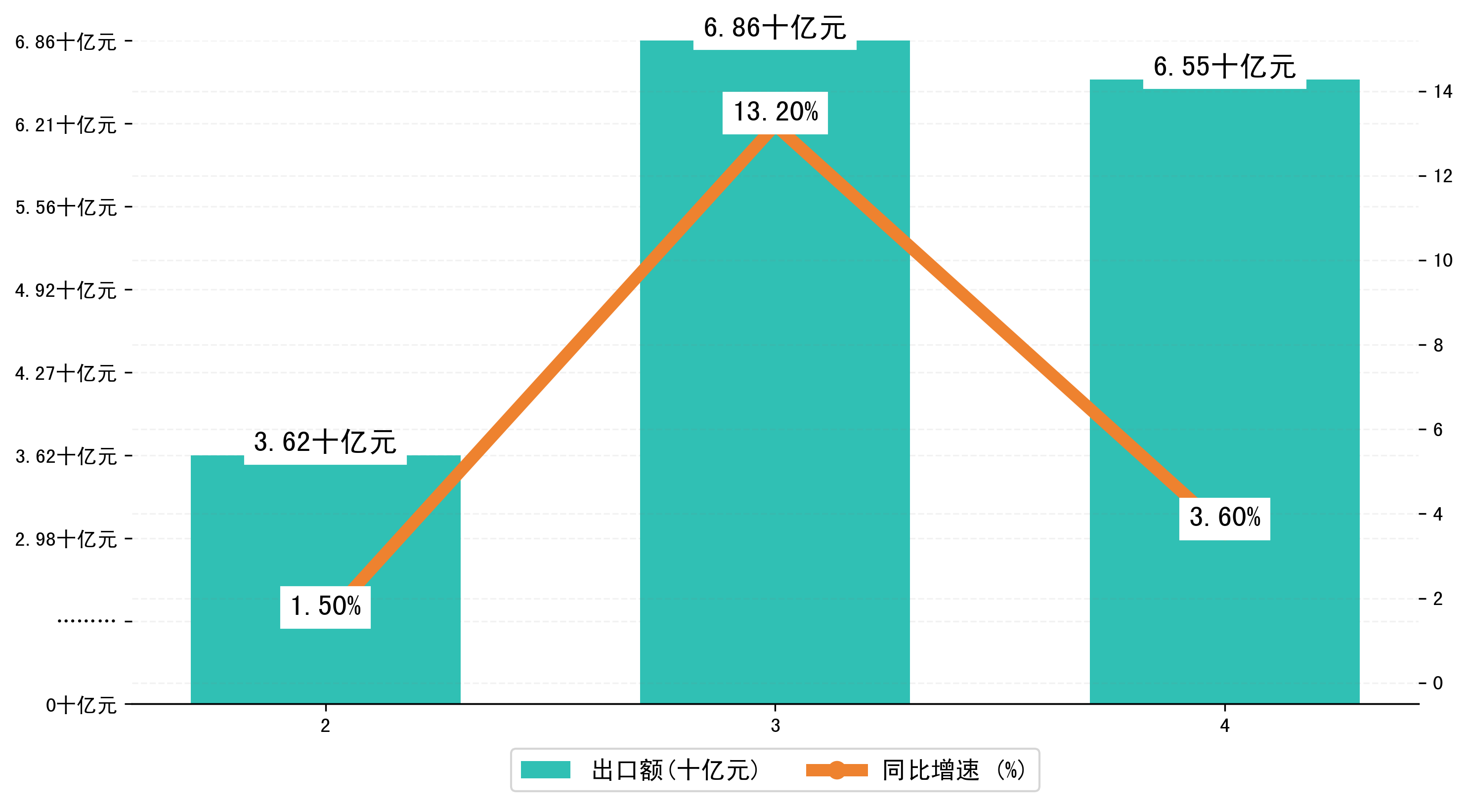 以人民币计,2024年4月保定市出口额为65,5176.7141万元,相比上月减少了3,0590.1442万元;相比上年同期减少了10,9799.2276万元,同比增加了3.60%。