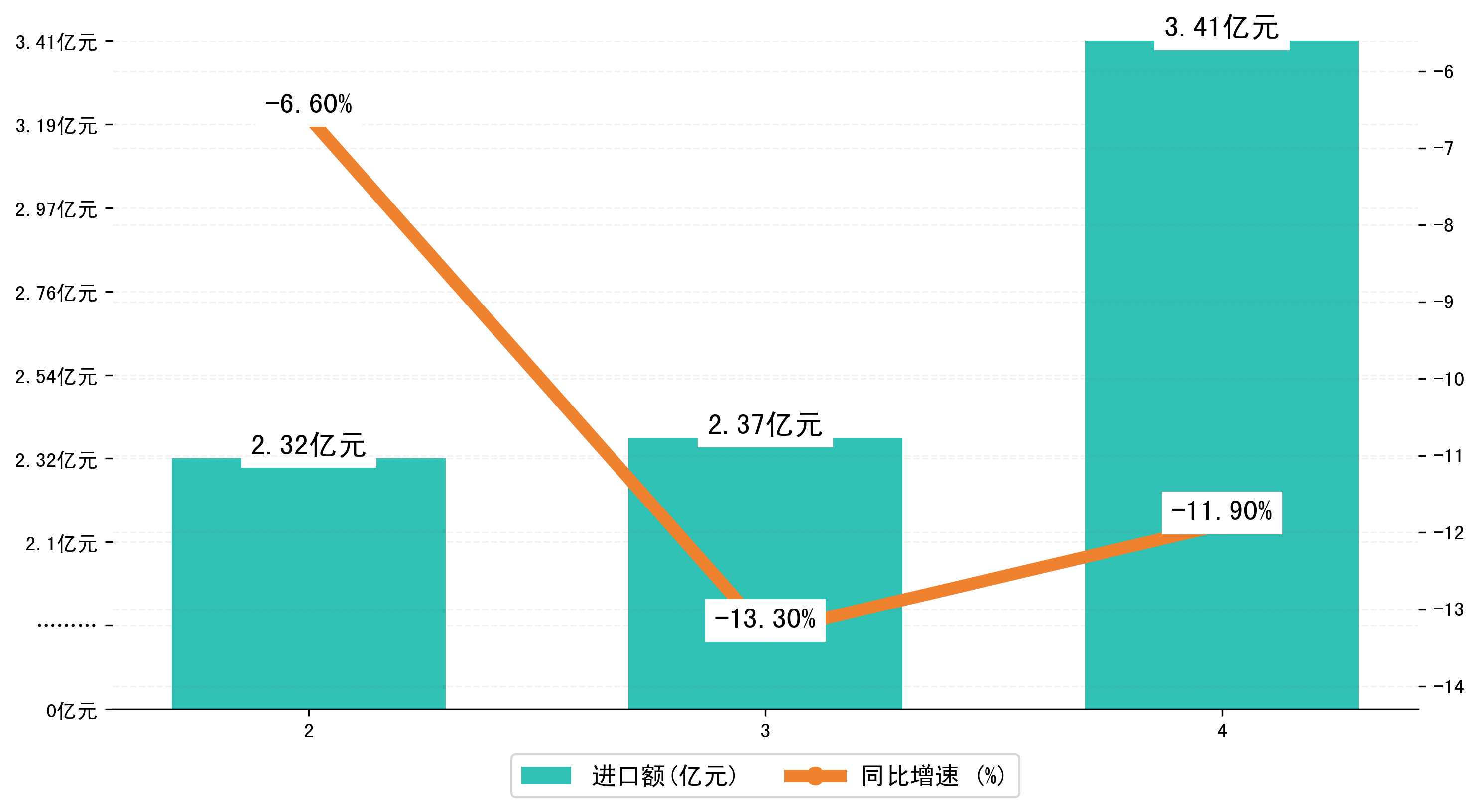 以美元计,2024年1-4月保定市进口额为1,5605.433万美元,相比上年同期减少了2711.1448万美元,同比减少-14.60%。