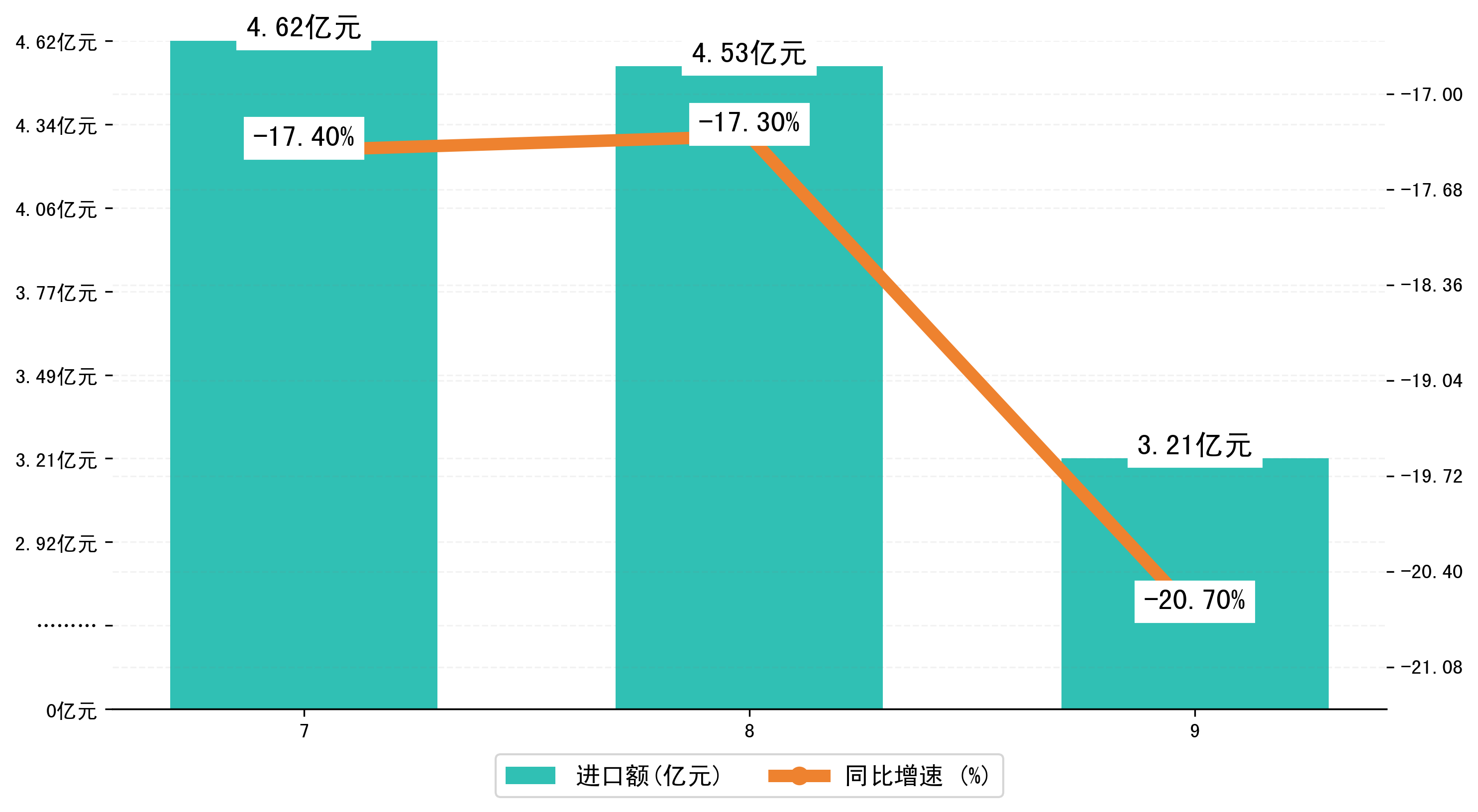 以美元计,2024年1-9月保定市进口额为4,1915.6859万美元,相比上年同期减少了1,1783.3995万美元,同比减少-21.90%。