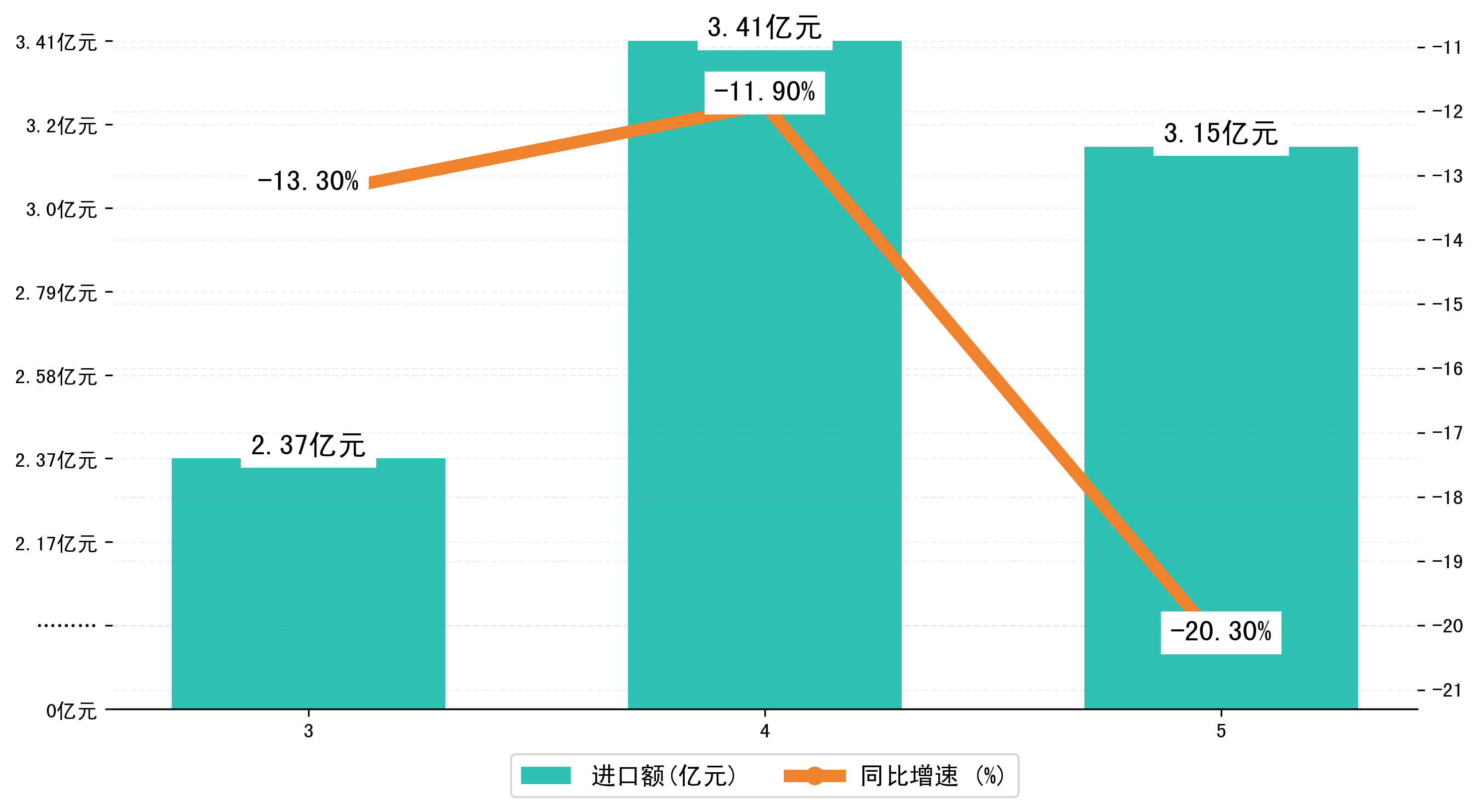 以人民币计,2024年1-5月保定市进口额为14,2302.6516万元,相比上年同期减少了3,6600.8312万元,同比减少了-20.30%。