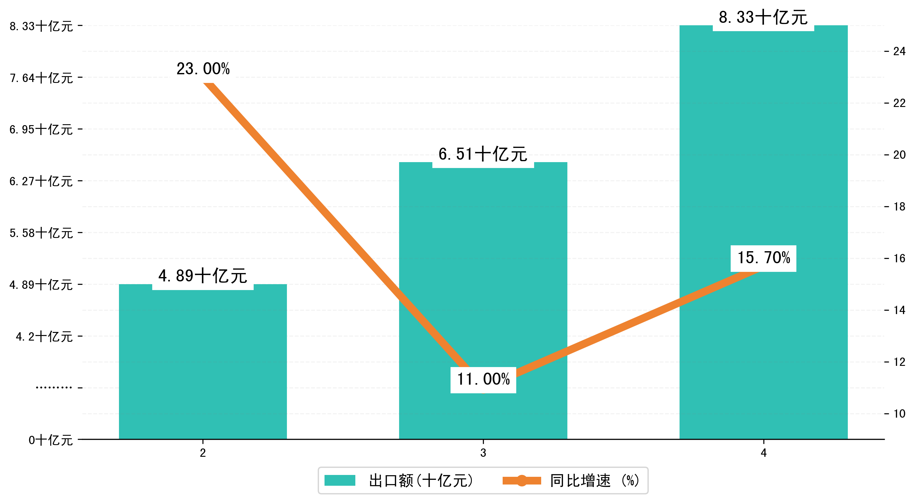 以人民币计,2025年1-4月保定市出口额为261,7920.9167万元,相比上年同期增加了35,4245.0269万元,同比增加了15.70%。