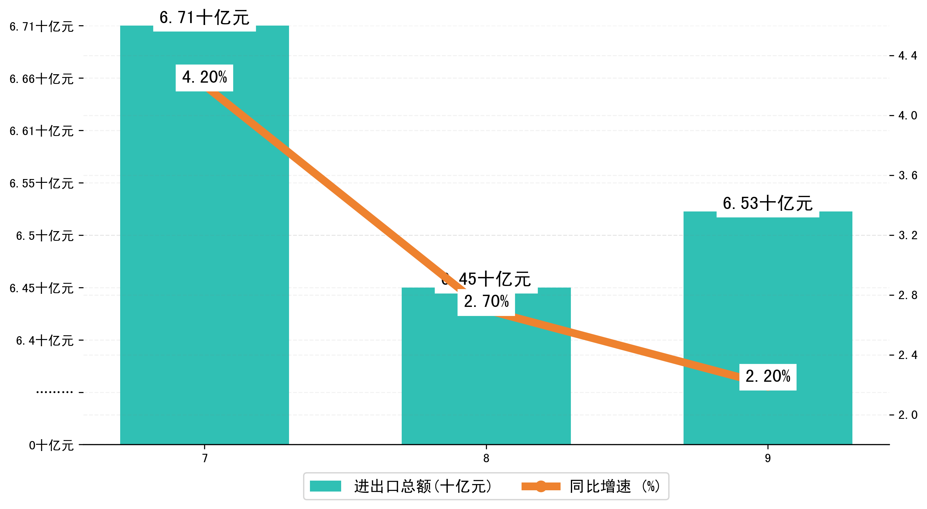 以人民币计,2025年9月保定市进出口总额为65,2550.8819万元,相比上月增加了7690.7357万元;相比上年同期减少了1,4470.2639万元,同比增加了2.20%。