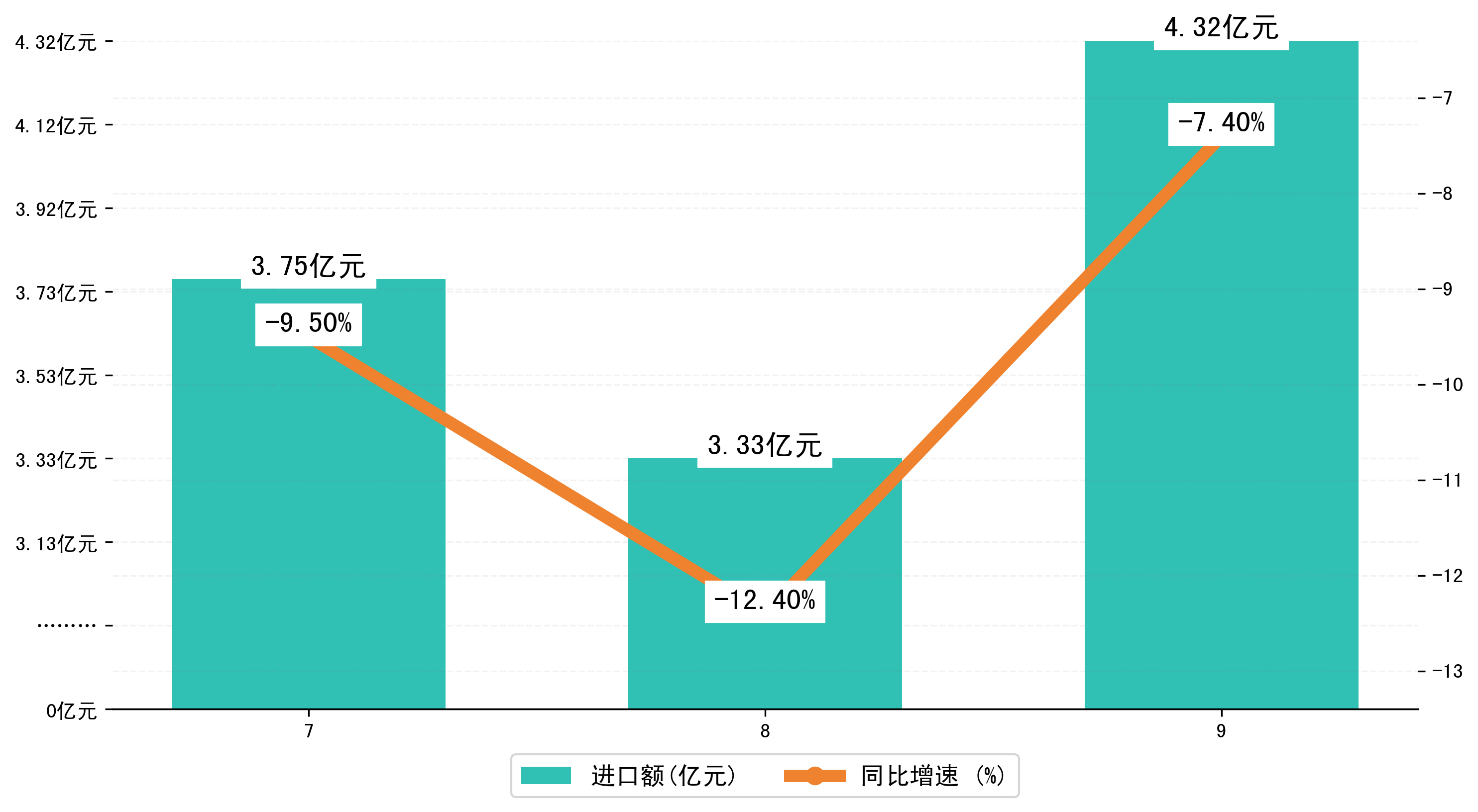 以美元计,2025年1-9月保定市进口额为3,8521.6397万美元,相比上年同期减少了3394.0462万美元,同比减少-8.10%。
