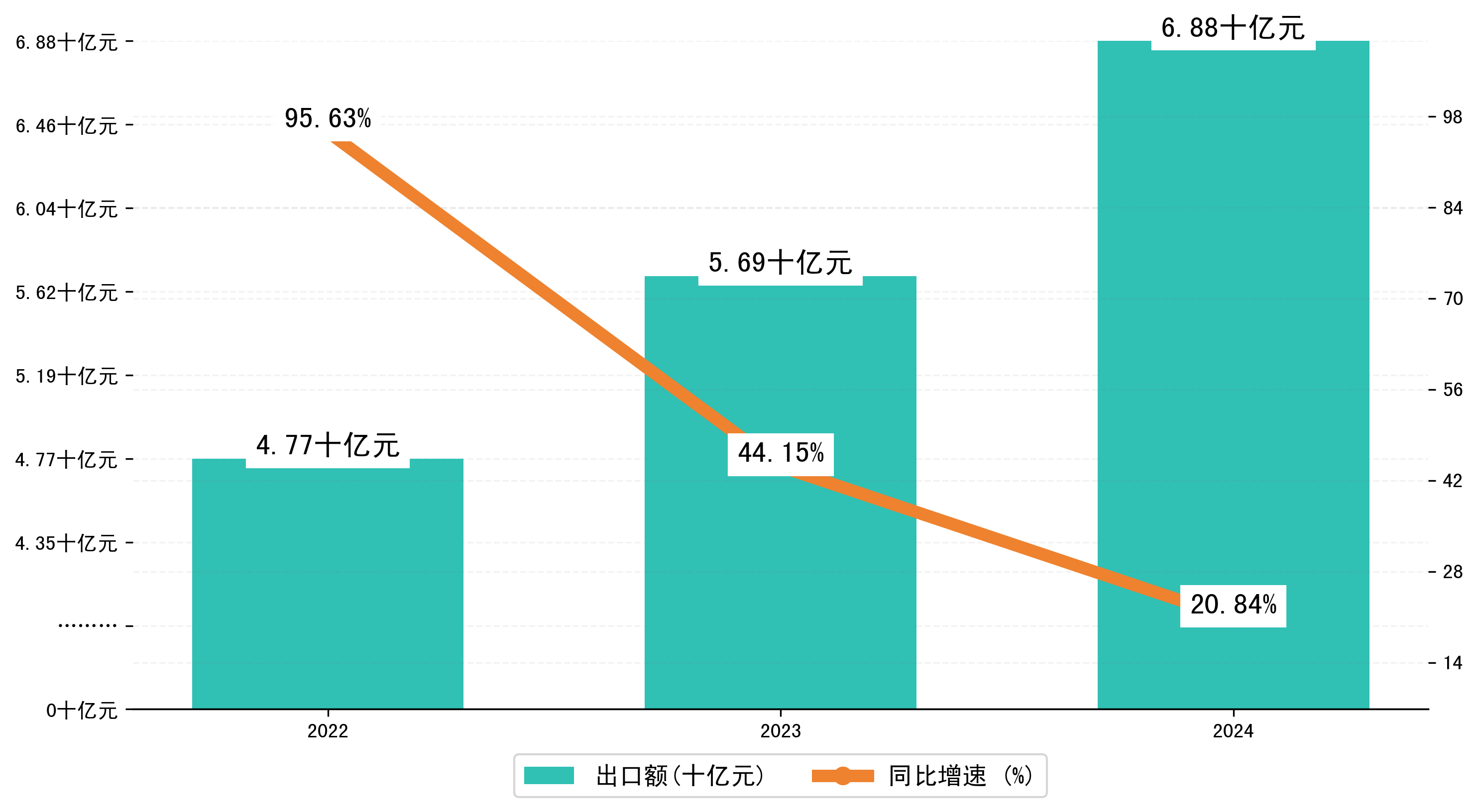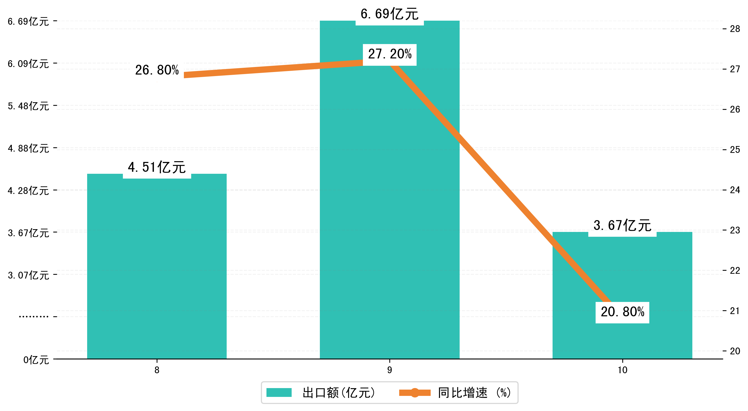 以美元计,2024年1-10月宝鸡市出口额为9,6802.364万美元,相比上年同期增加了1,5337.3799万美元,同比增加18.80%。