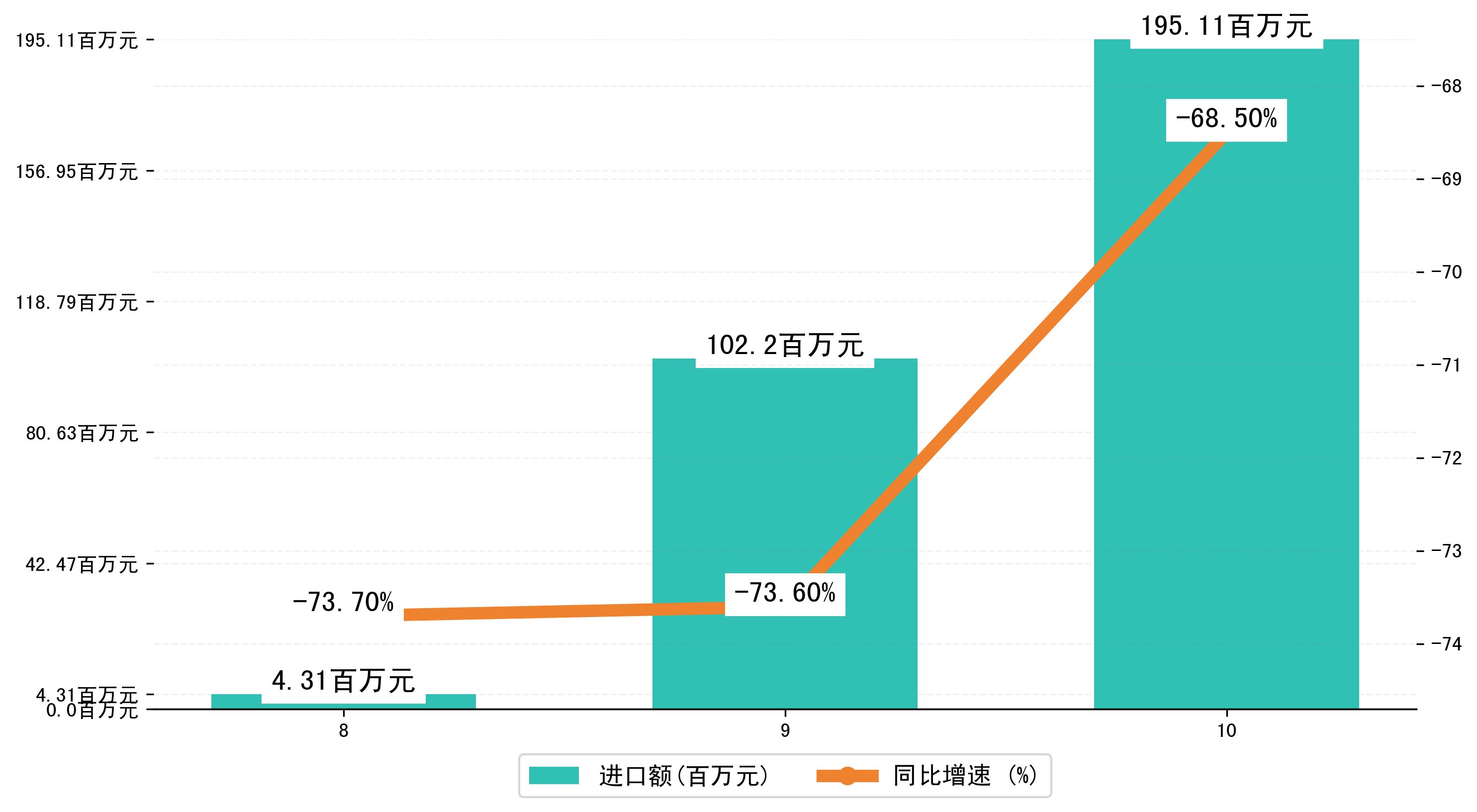 以人民币计,2024年1-10月宝鸡市进口额为8,7327.4119万元,相比上年同期减少了19,1366.8372万元,同比减少了-68.50%。