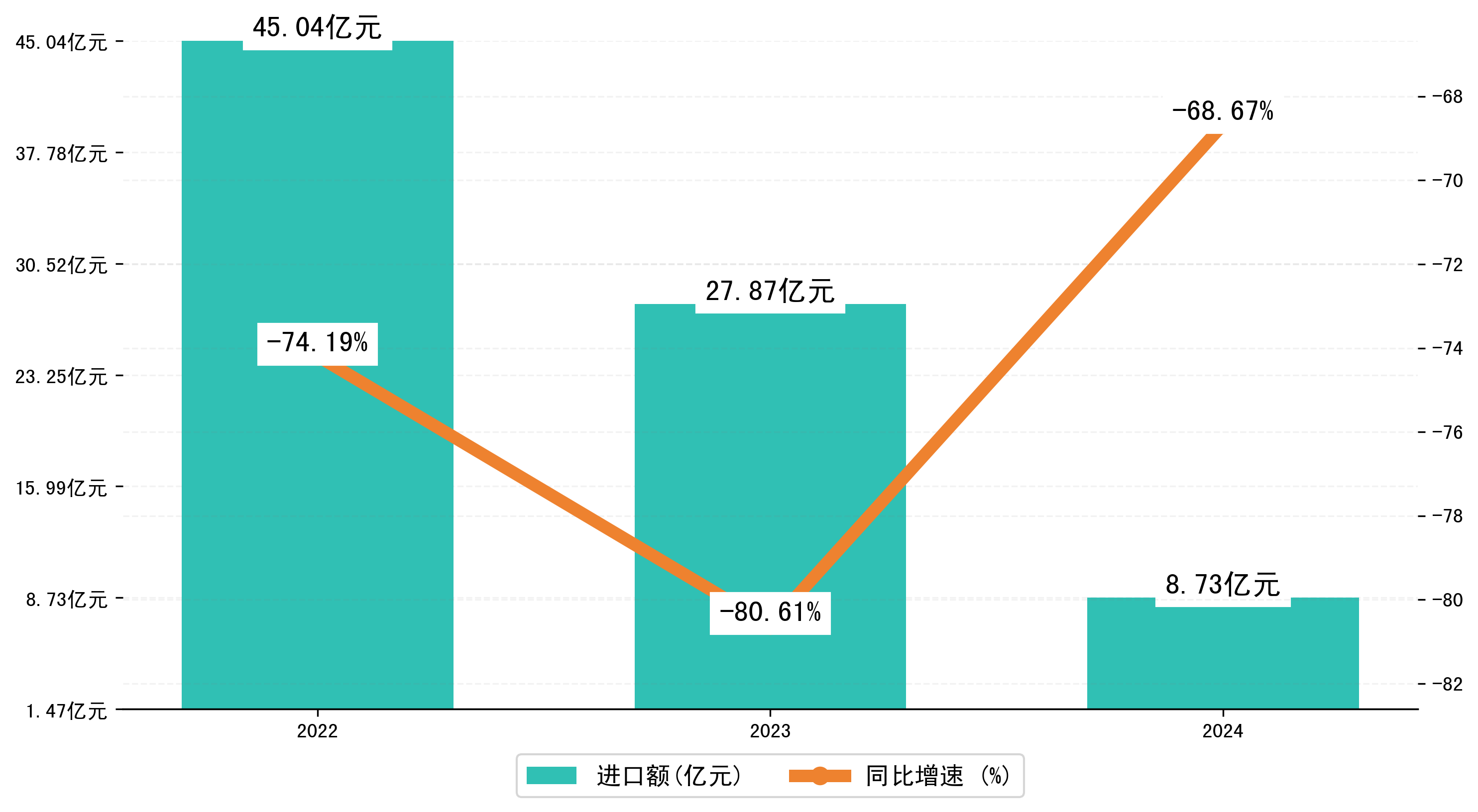 以美元计,2024年1-10月宝鸡市进口额为1,2290.9976万美元,相比上年同期减少了2,7594.6222万美元,同比减少-69.00%。