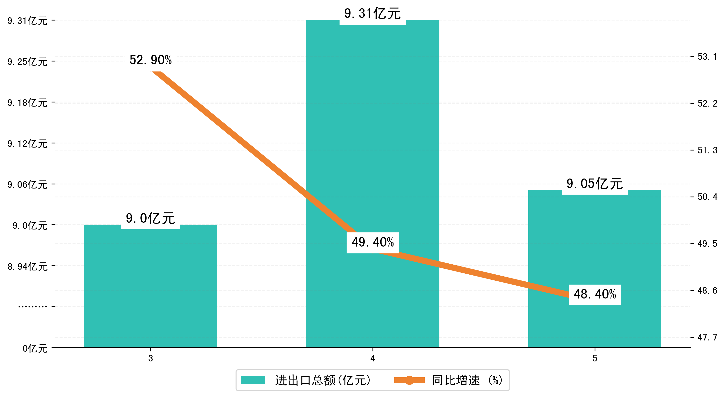 以人民币计,2023年5月宝鸡市进出口总额为9,0519.5626万元,相比上月减少了2546.4219万元;相比上年同期增加了2,2067.8185万元,同比增加了48.40%。