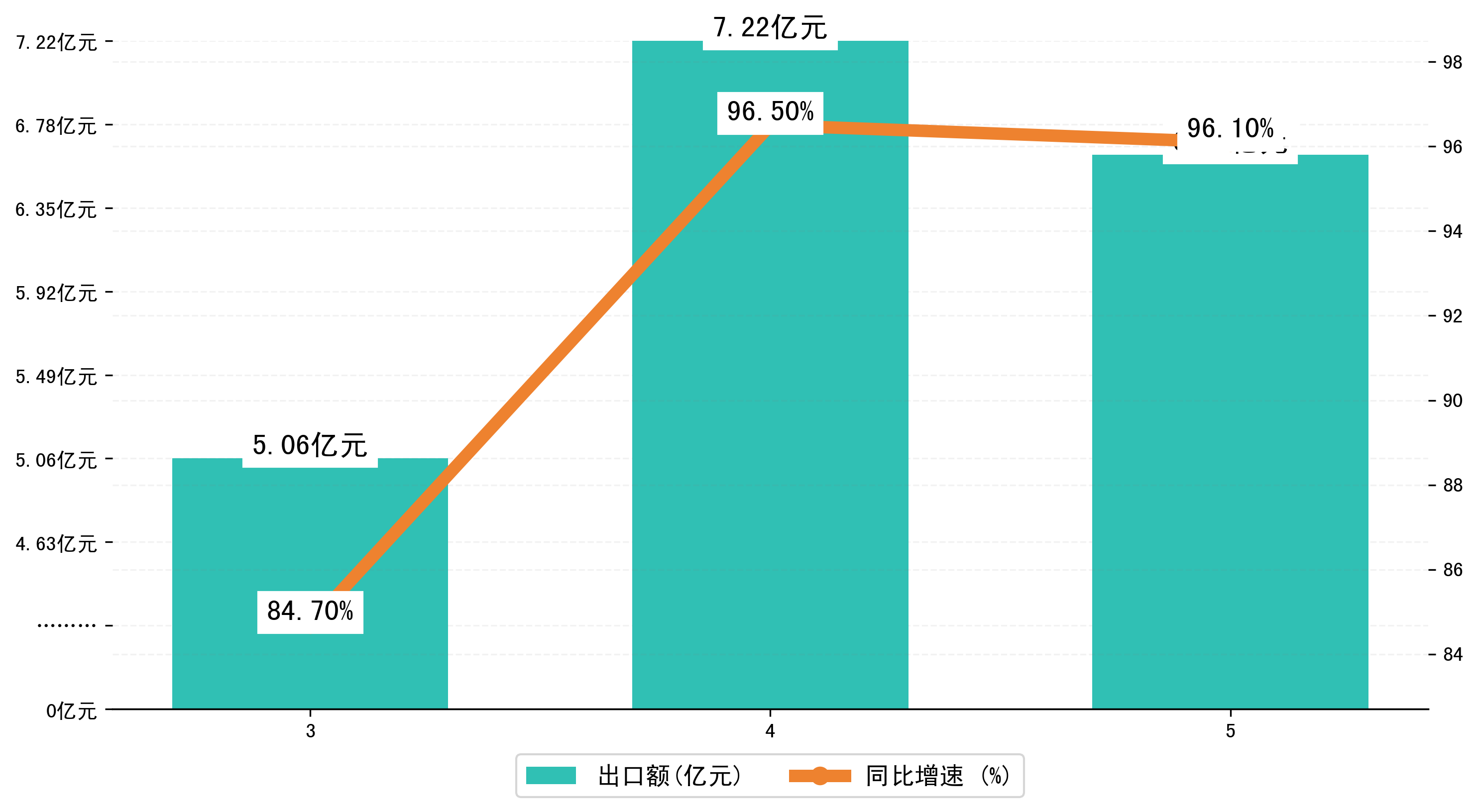 以人民币计,2023年5月宝鸡市出口额为6,6254.1852万元,相比上月减少了5897.058万元;相比上年同期增加了3,2229.2749万元,同比增加了96.10%。