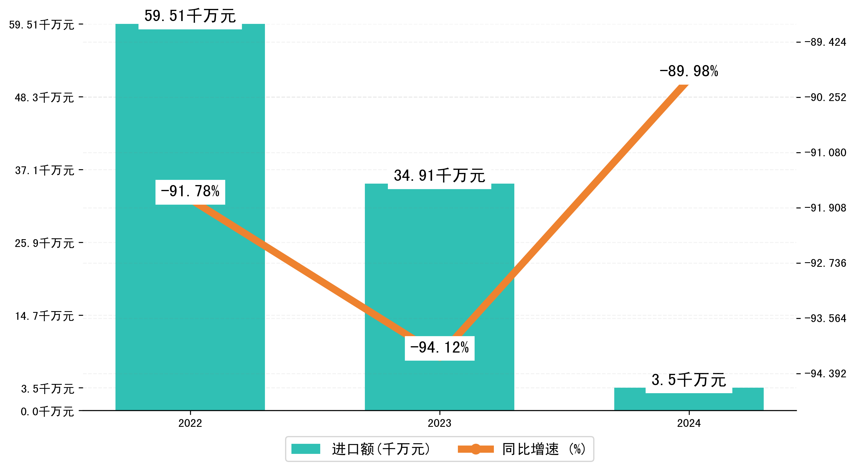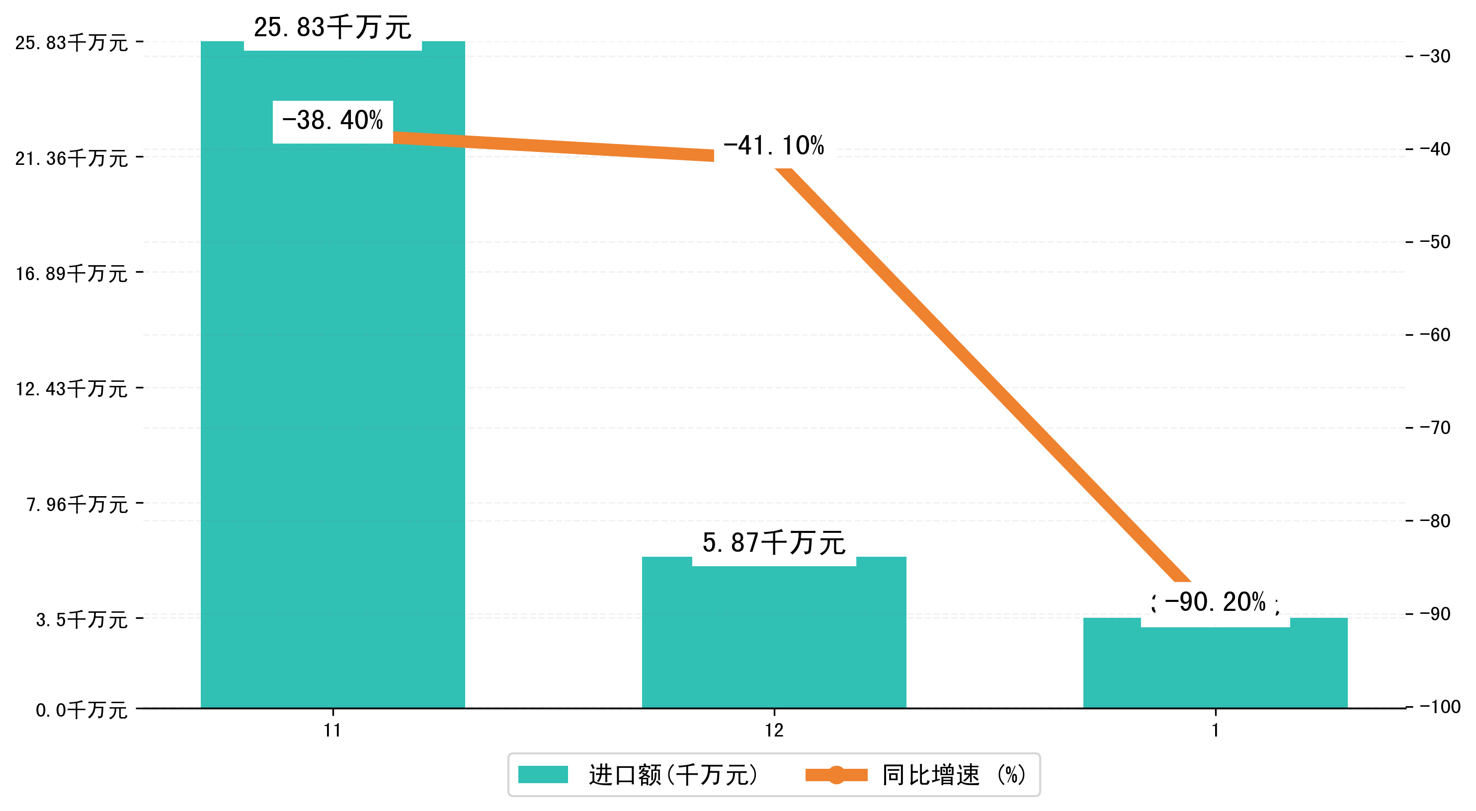以人民币计,2024年1-1月宝鸡市进口额为3498.4331万元,相比上年同期减少了3,1415.8916万元,同比减少了-90.20%。