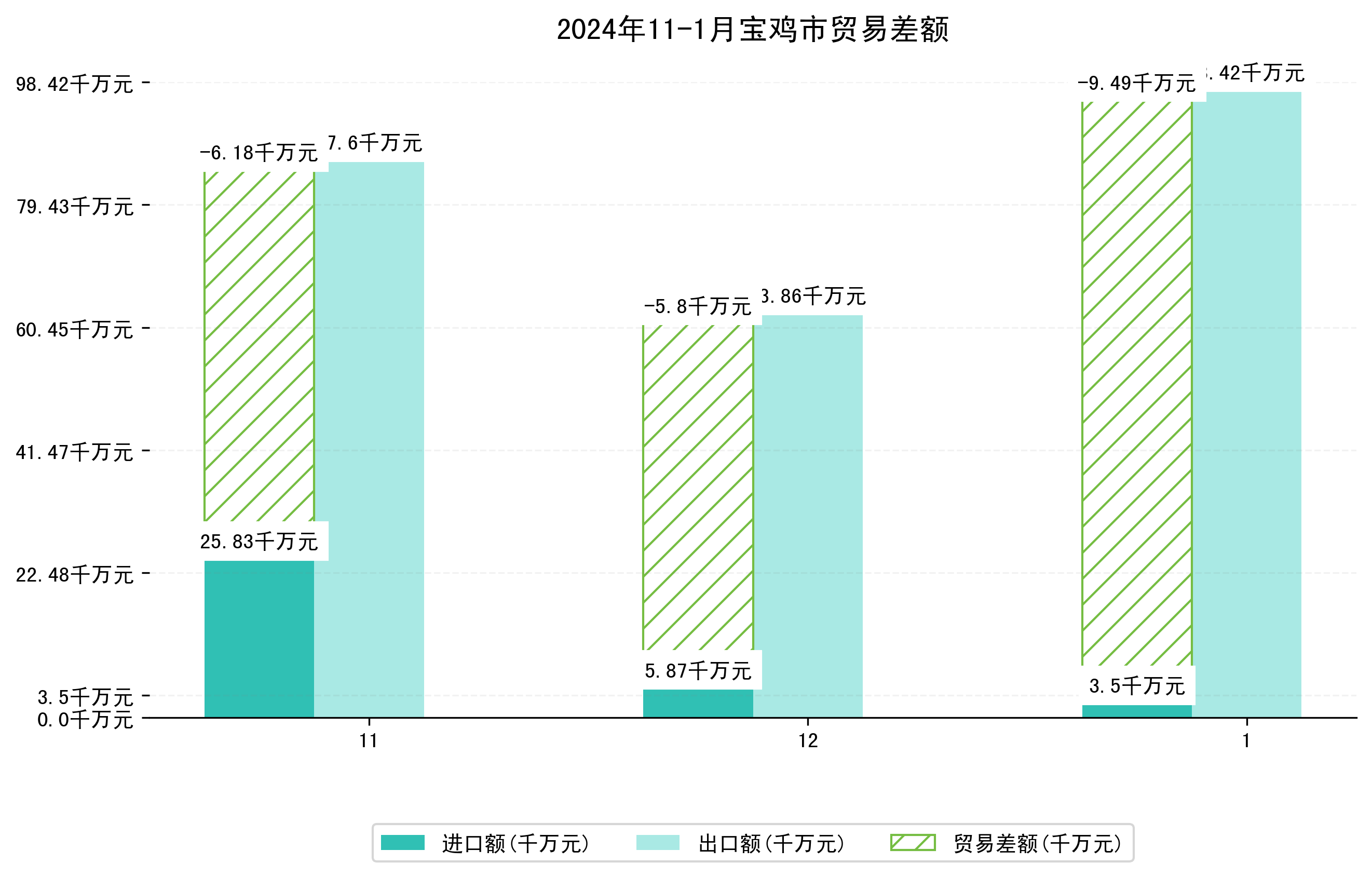以人民币计,2024年1-1月宝鸡市贸易差额为9,4919,3001万元(贸易顺差),相比上年同期增加了4,6617,8185万元,同比增加96.51%。