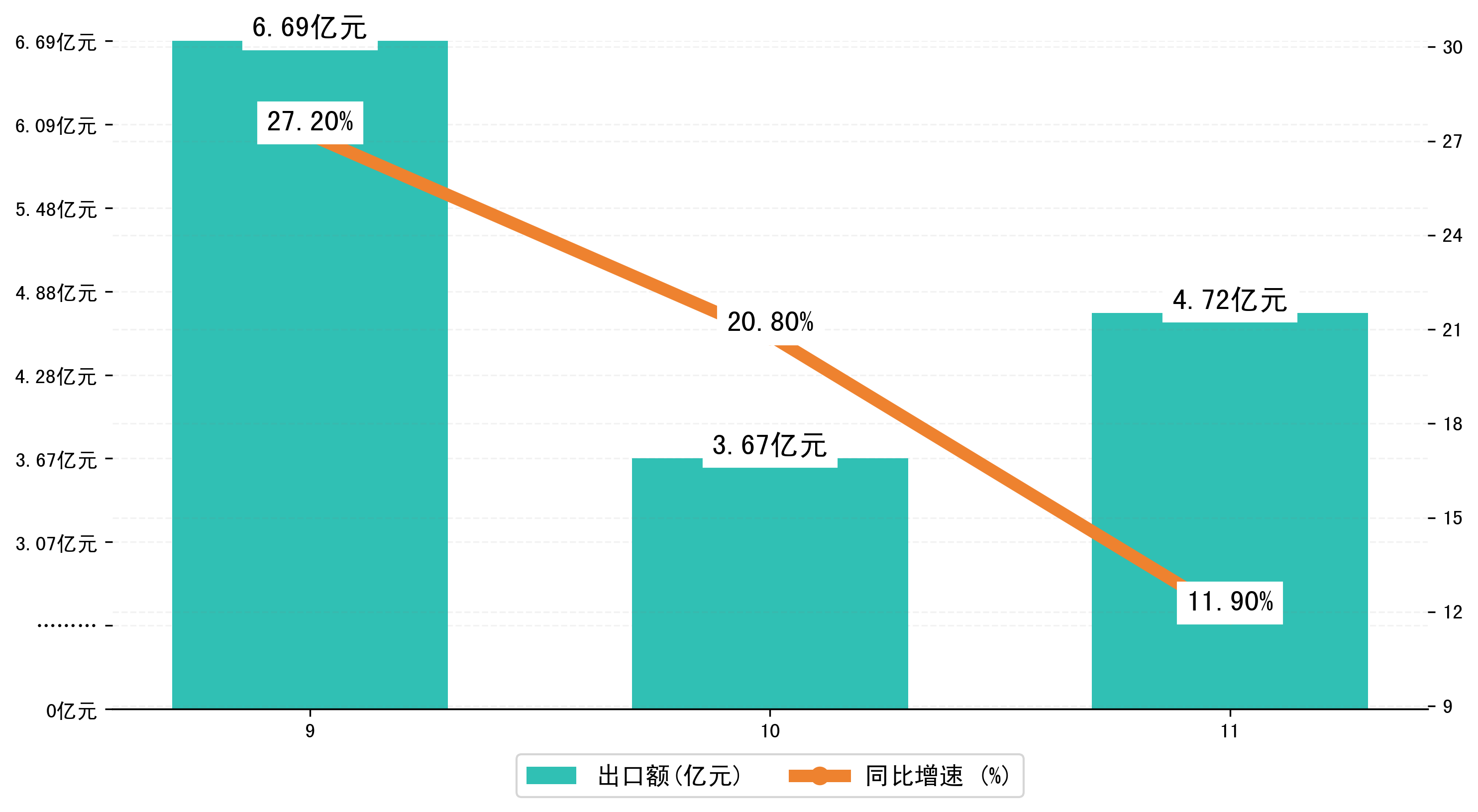 以人民币计,2024年11月宝鸡市出口额为4,7242.2691万元,相比上月增加了1,0502.2789万元;相比上年同期减少了4,0357.2505万元,同比增加了11.90%。