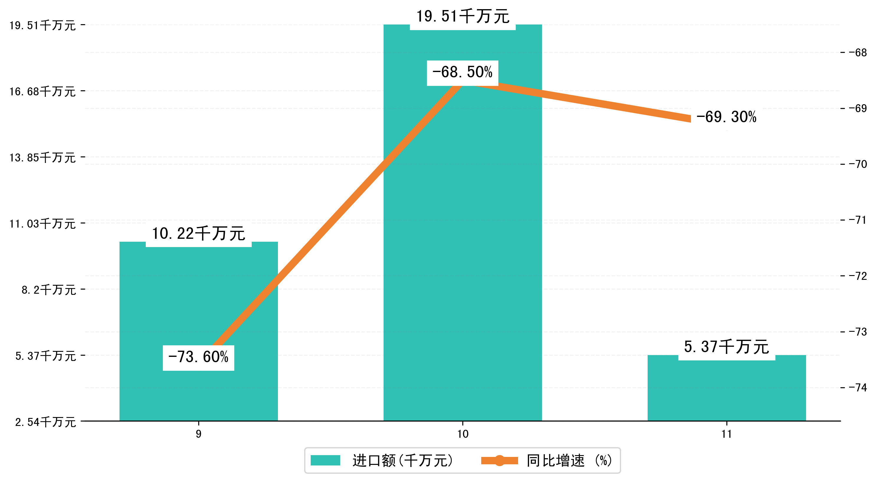 以美元计,2024年11月宝鸡市进口额为754.4415万美元,相比上月减少了1999.7929万美元;相比上年同期减少了2845.4673万美元,同比减少-69.80%。