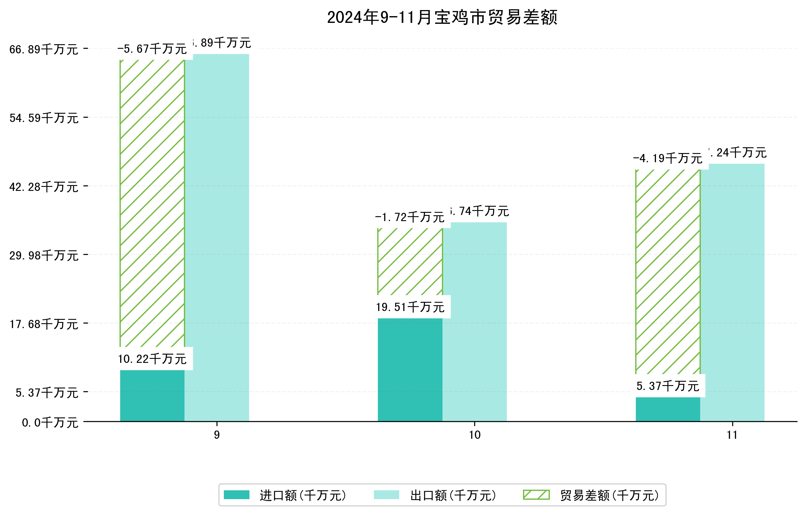 以美元计,2024年1-11月宝鸡市贸易差额为9,0350,9987万美元(贸易顺差),相比上年同期增加了4,0092,4997万美元,同比增加79.77%。