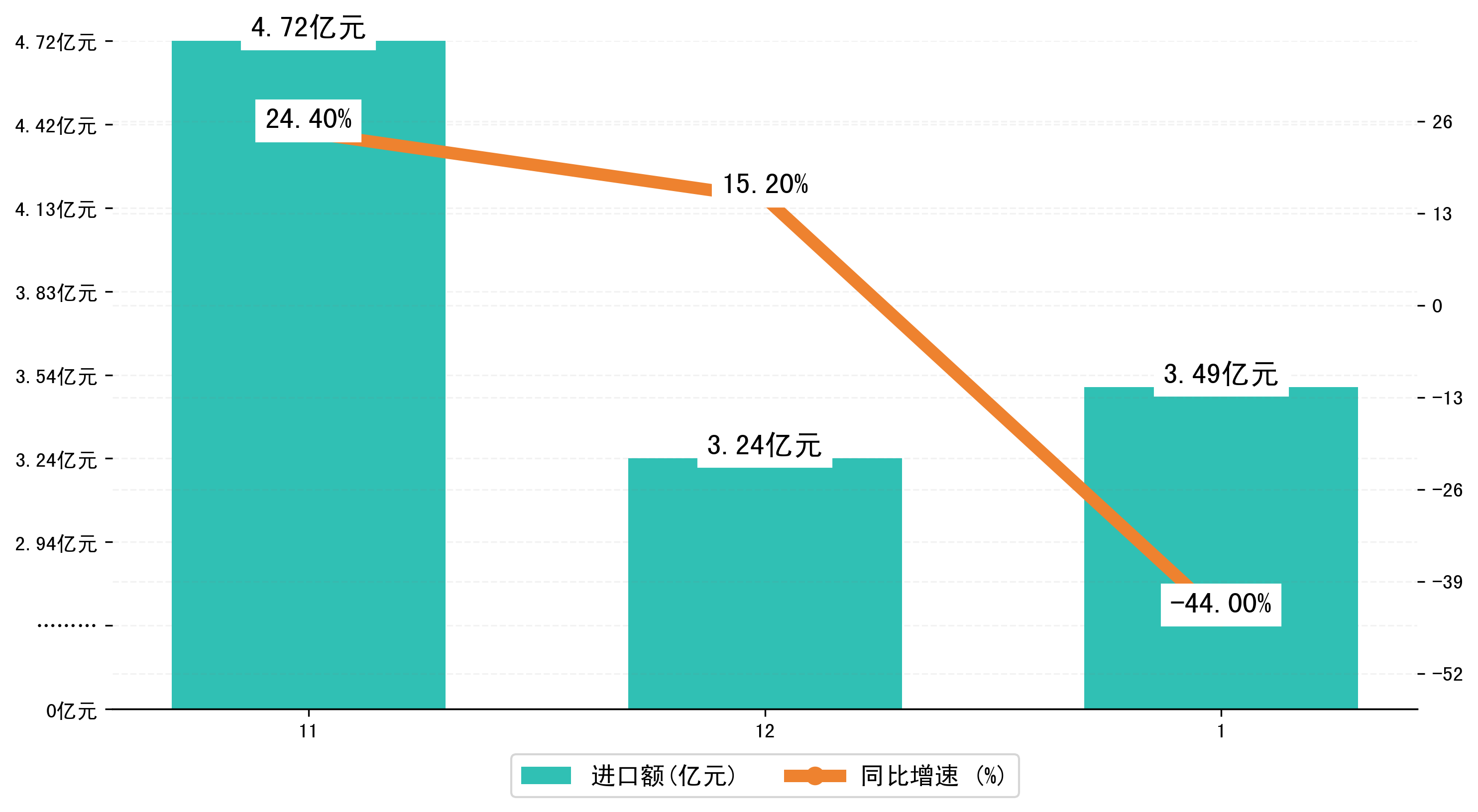 以美元计,2023年1-1月宝鸡市进口额为4998.6768万美元,相比上年同期减少了4339.0778万美元,同比减少-48.90%。