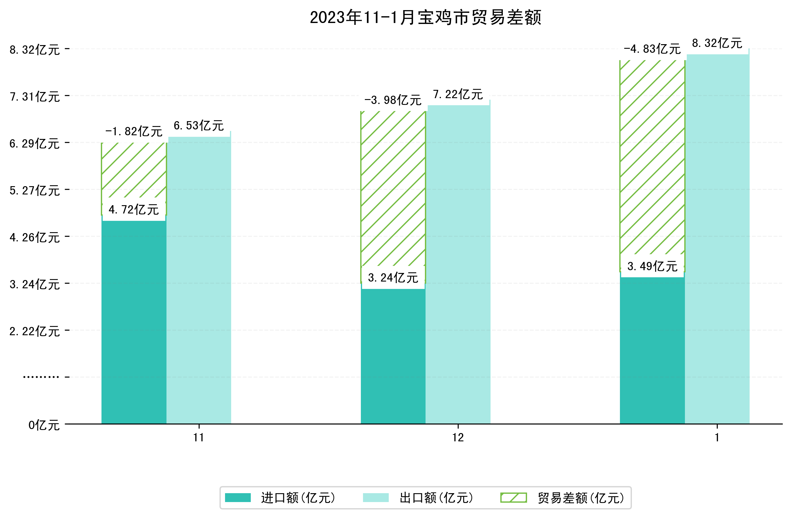 以人民币计,2023年1-1月宝鸡市贸易差额为4,8301,4816万元(贸易顺差),相比上年同期增加了6,6483,3058万元,同比增加-365.66%。