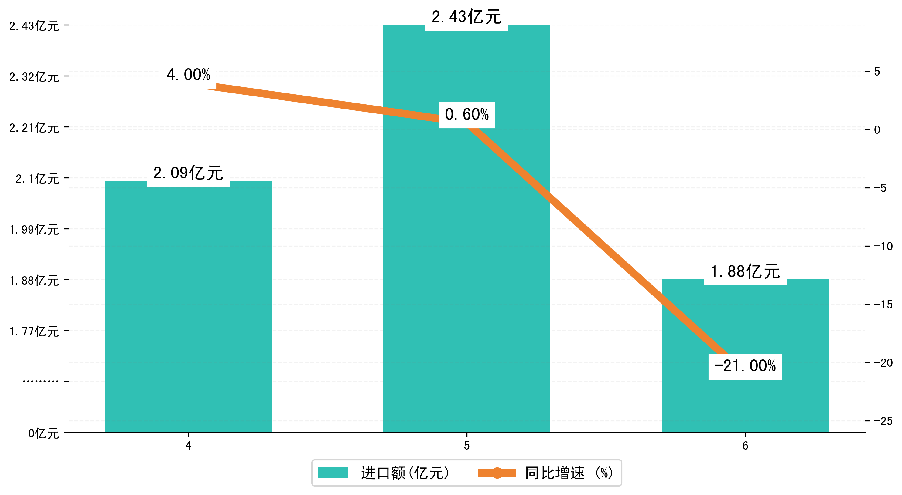 以人民币计,2023年6月宝鸡市进口额为1,8798.8864万元,相比上月减少了5466.491万元;相比上年同期减少了5,1554.1941万元,同比减少了-21.00%。