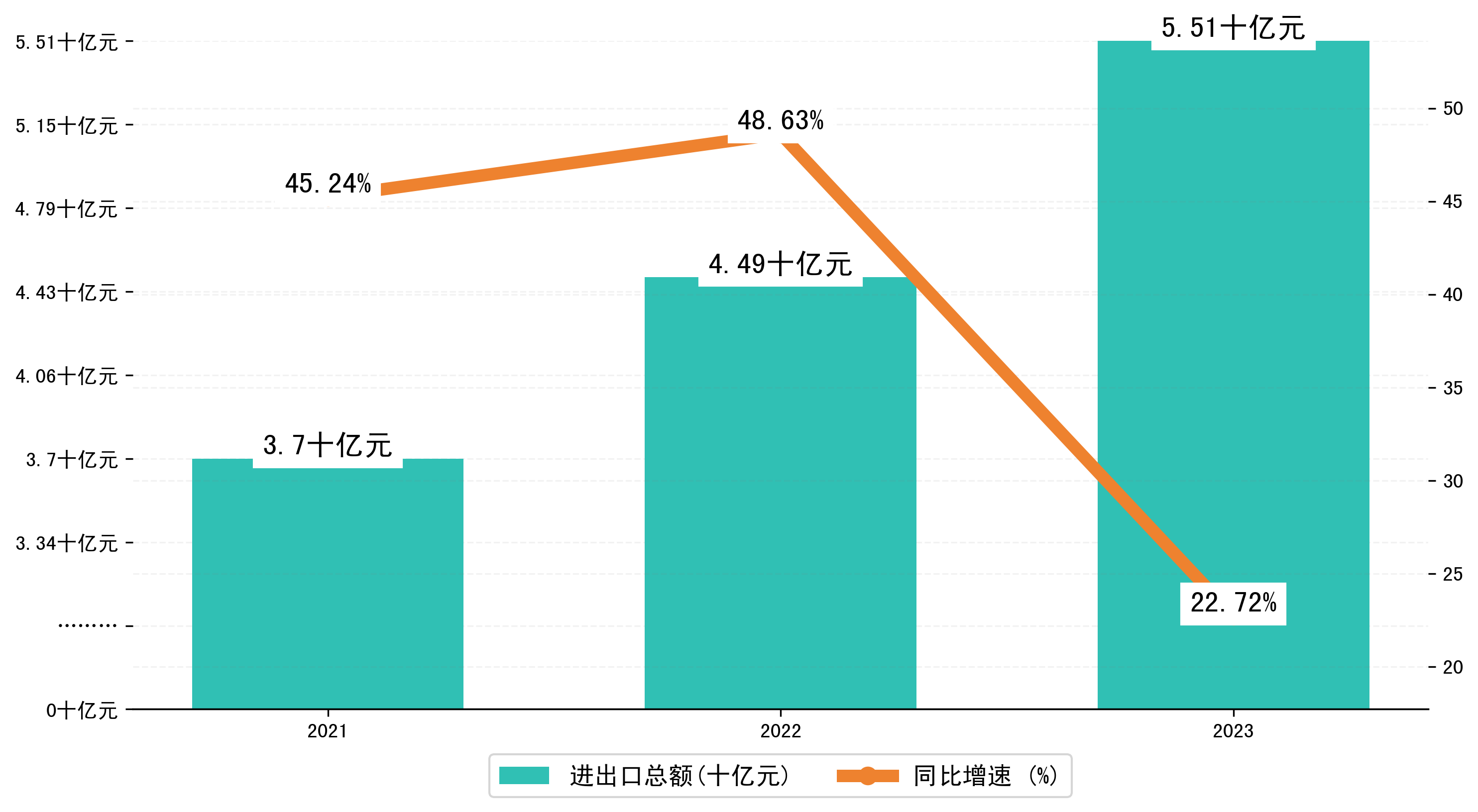 以美元计,2023年1-6月宝鸡市进出口总额为7,9901.2051万美元,相比上年同期增加了1,0270.8446万美元,同比增加17.90%。