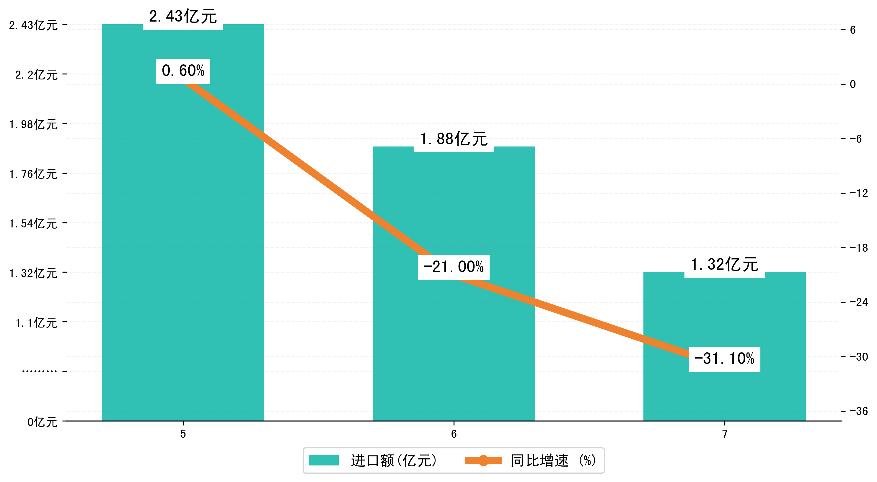 以美元计,2023年1-7月宝鸡市进口额为2,8129.2785万美元,相比上年同期减少了1,8168.2874万美元,同比减少-35.10%。