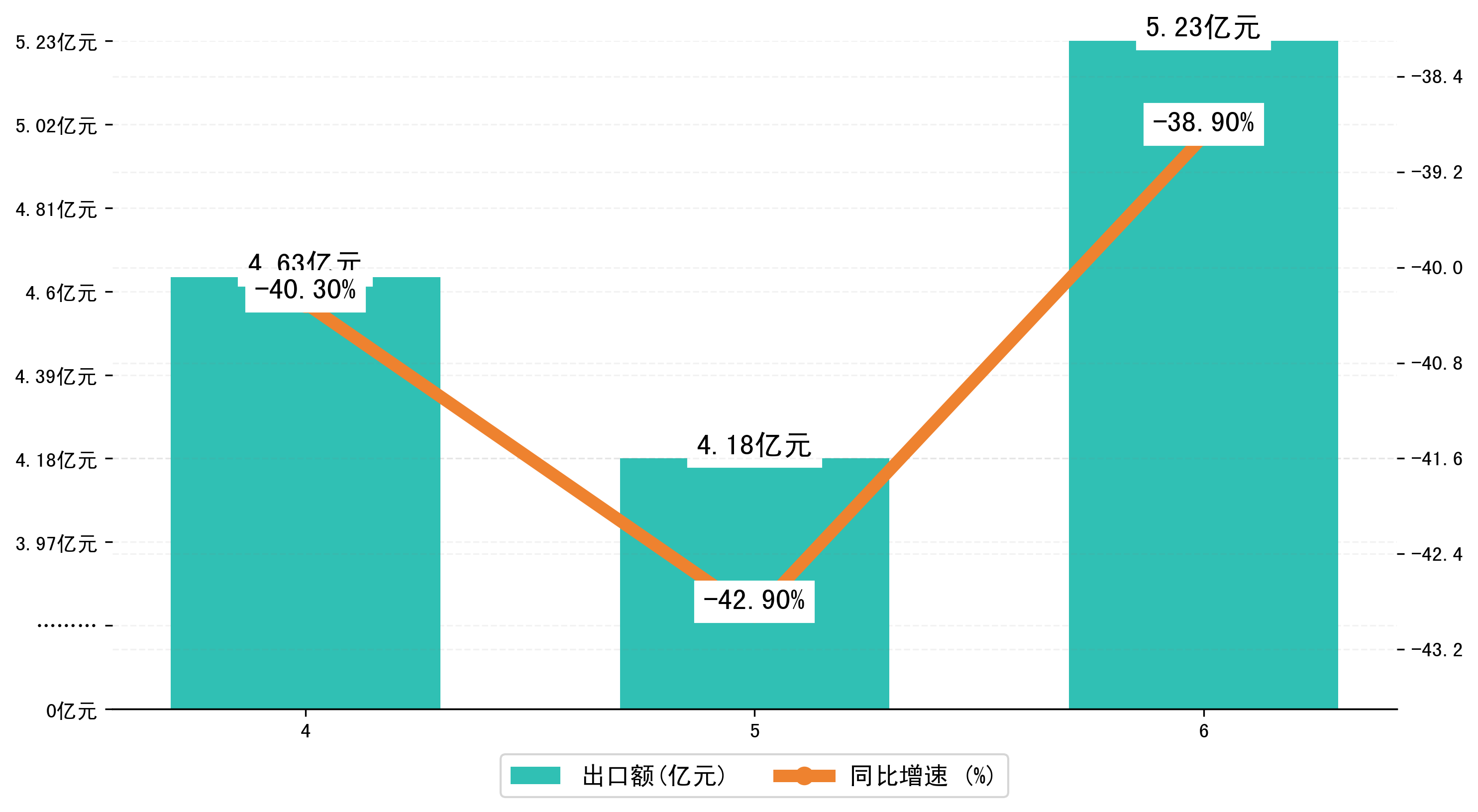 以人民币计,2025年6月宝鸡市出口额为5,2264.9437万元,相比上月增加了1,0477.5953万元;相比上年同期减少了6245.1627万元,同比减少了-38.90%。