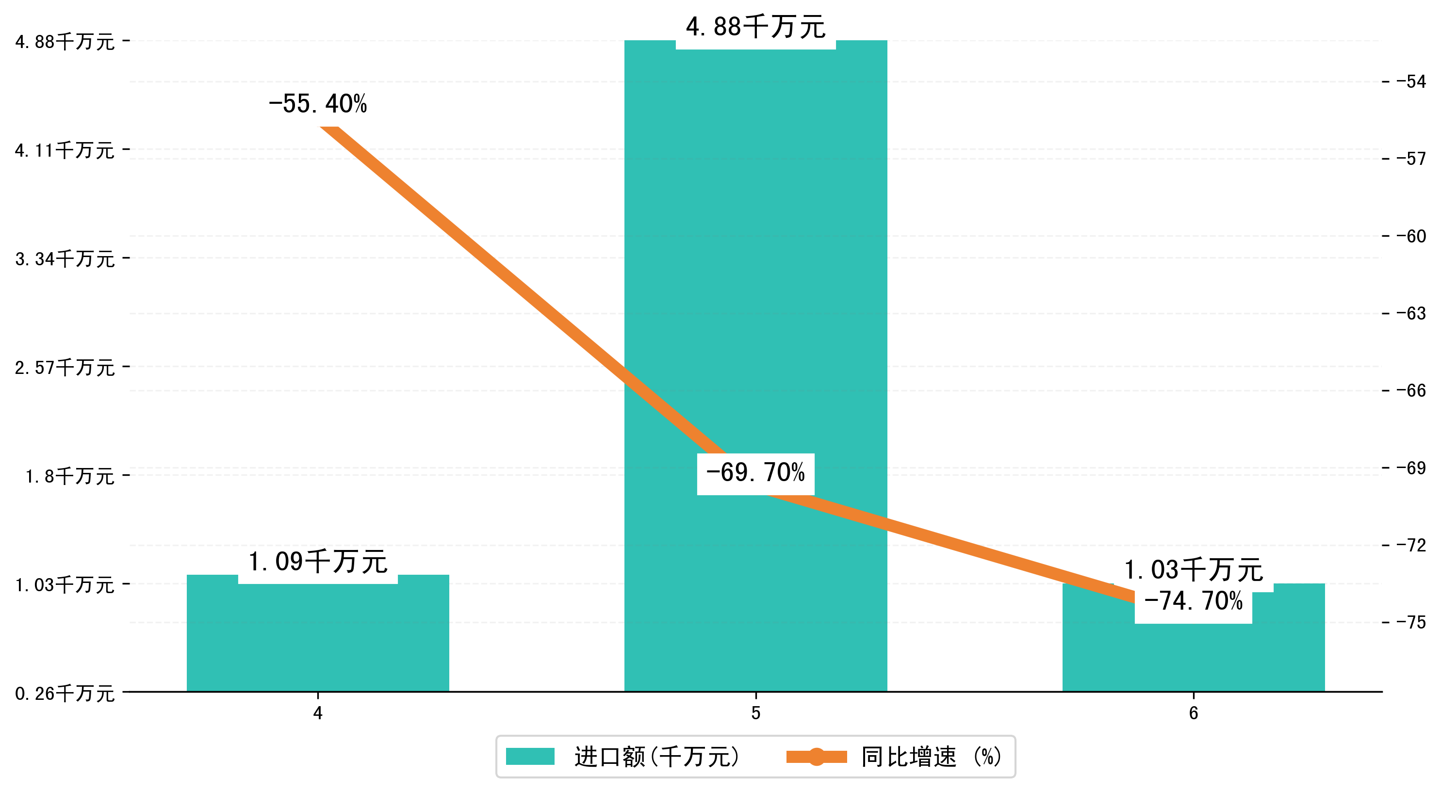 以人民币计,2025年6月宝鸡市进口额为1028.8742万元,相比上月减少了3848.525万元;相比上年同期减少了1,0952.3707万元,同比减少了-74.70%。