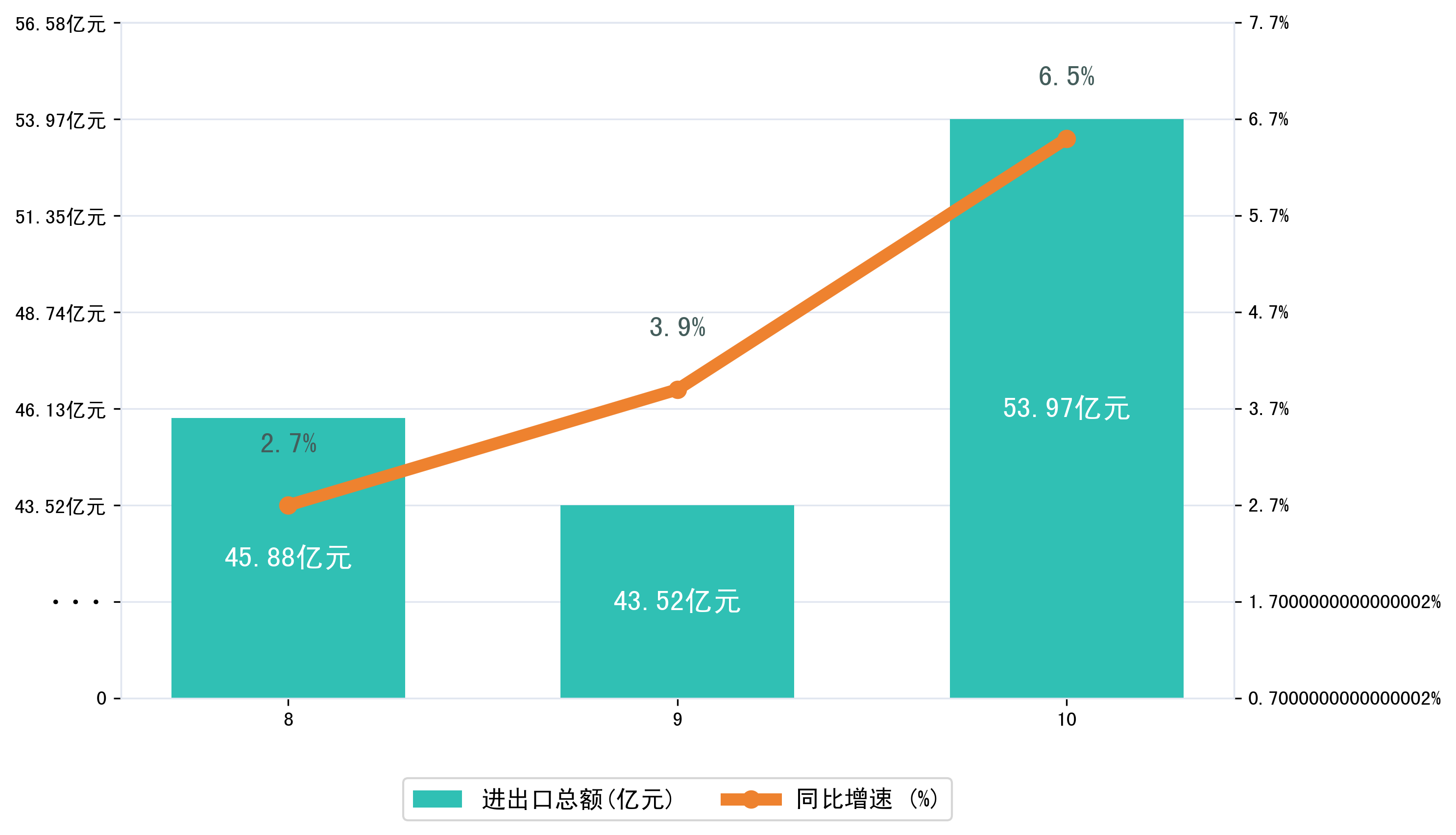 以人民币计,2025年10月湛江市进出口总额为53,9659.6542万元,相比上月增加了10,4500.4958万元;相比上年同期增加了14,7288.6857万元,同比增加了6.50%。