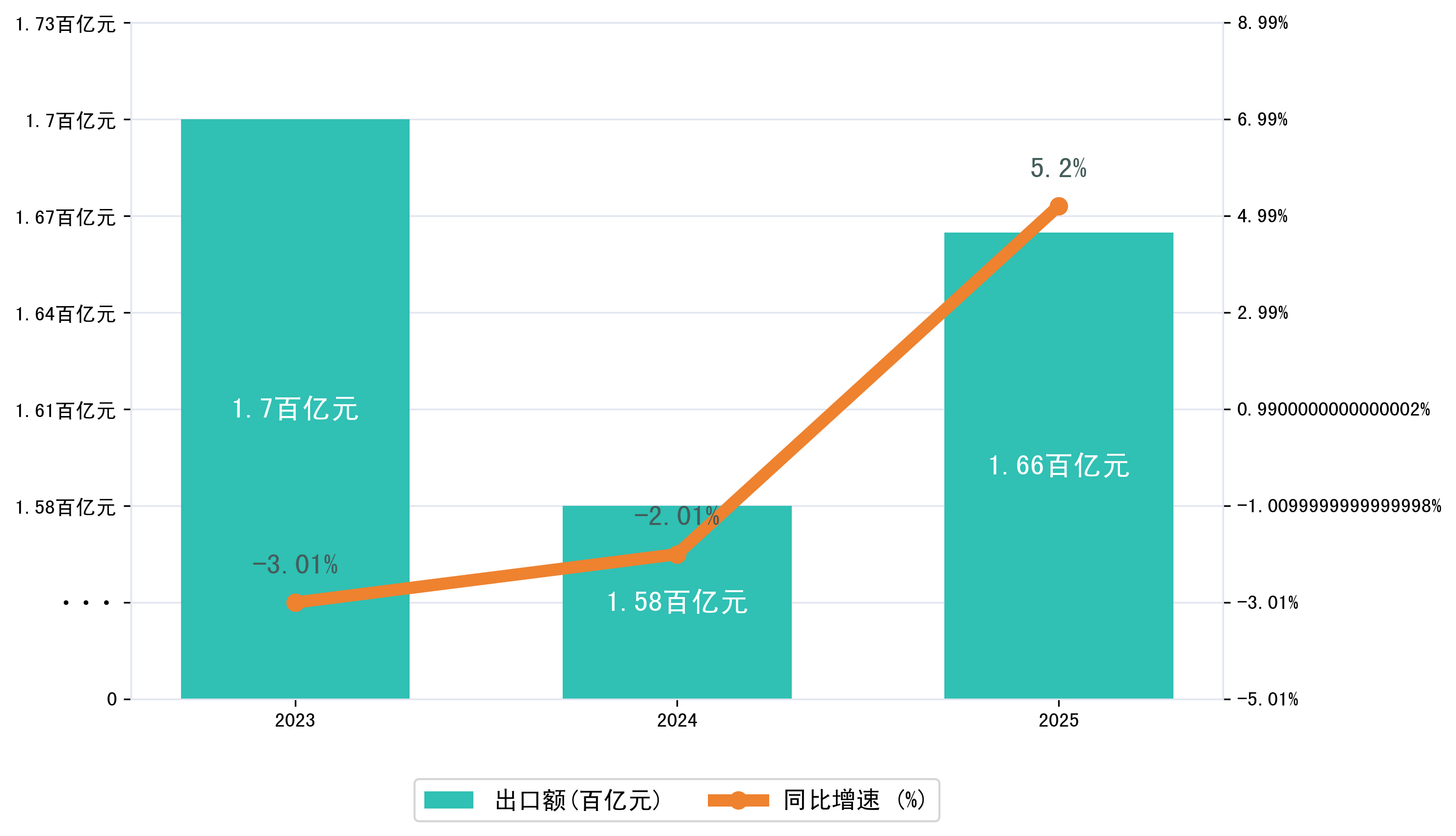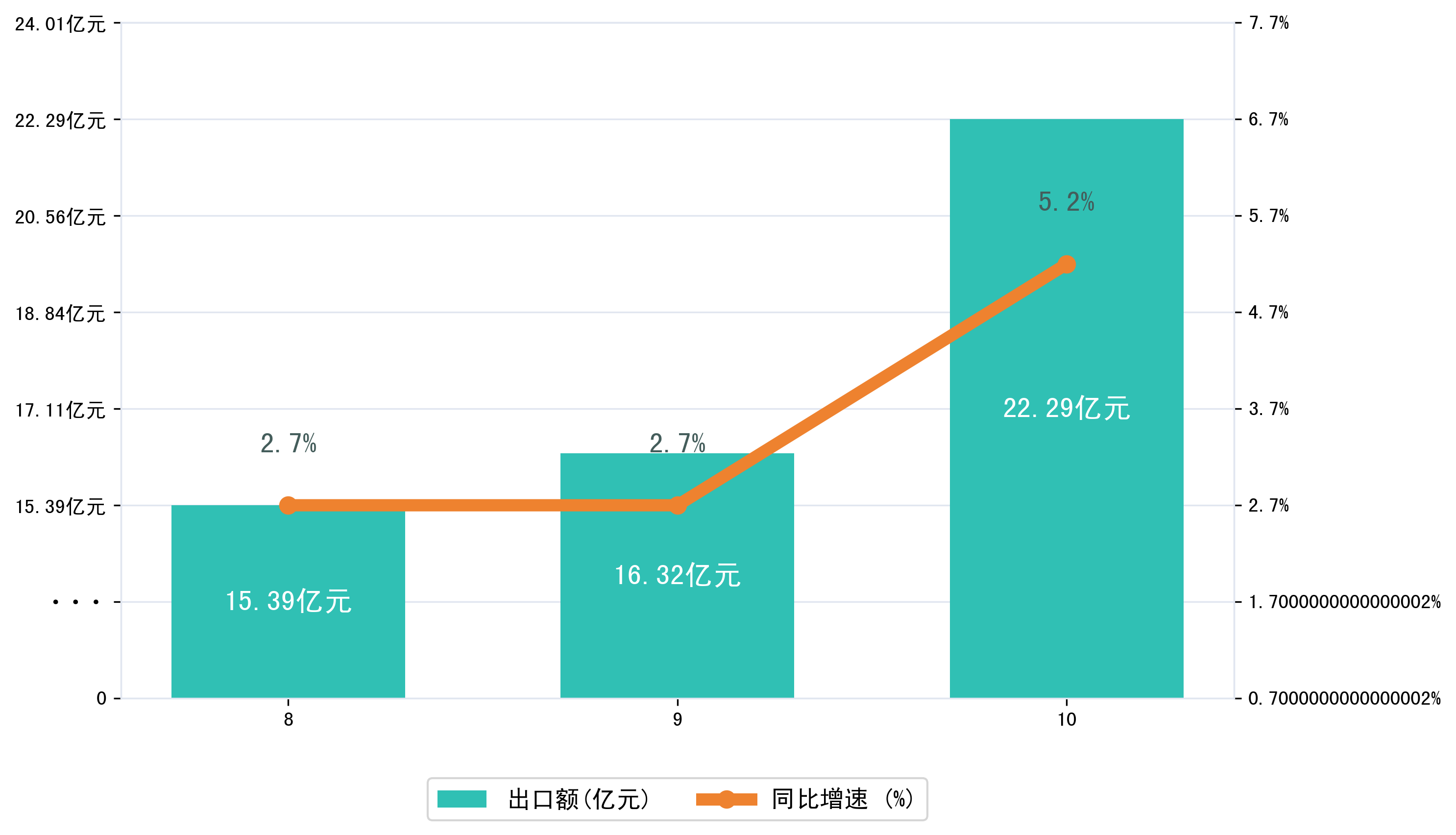 以人民币计,2025年1-10月湛江市出口额为166,2704.6383万元,相比上年同期增加了8,2126.2952万元,同比增加了5.20%。