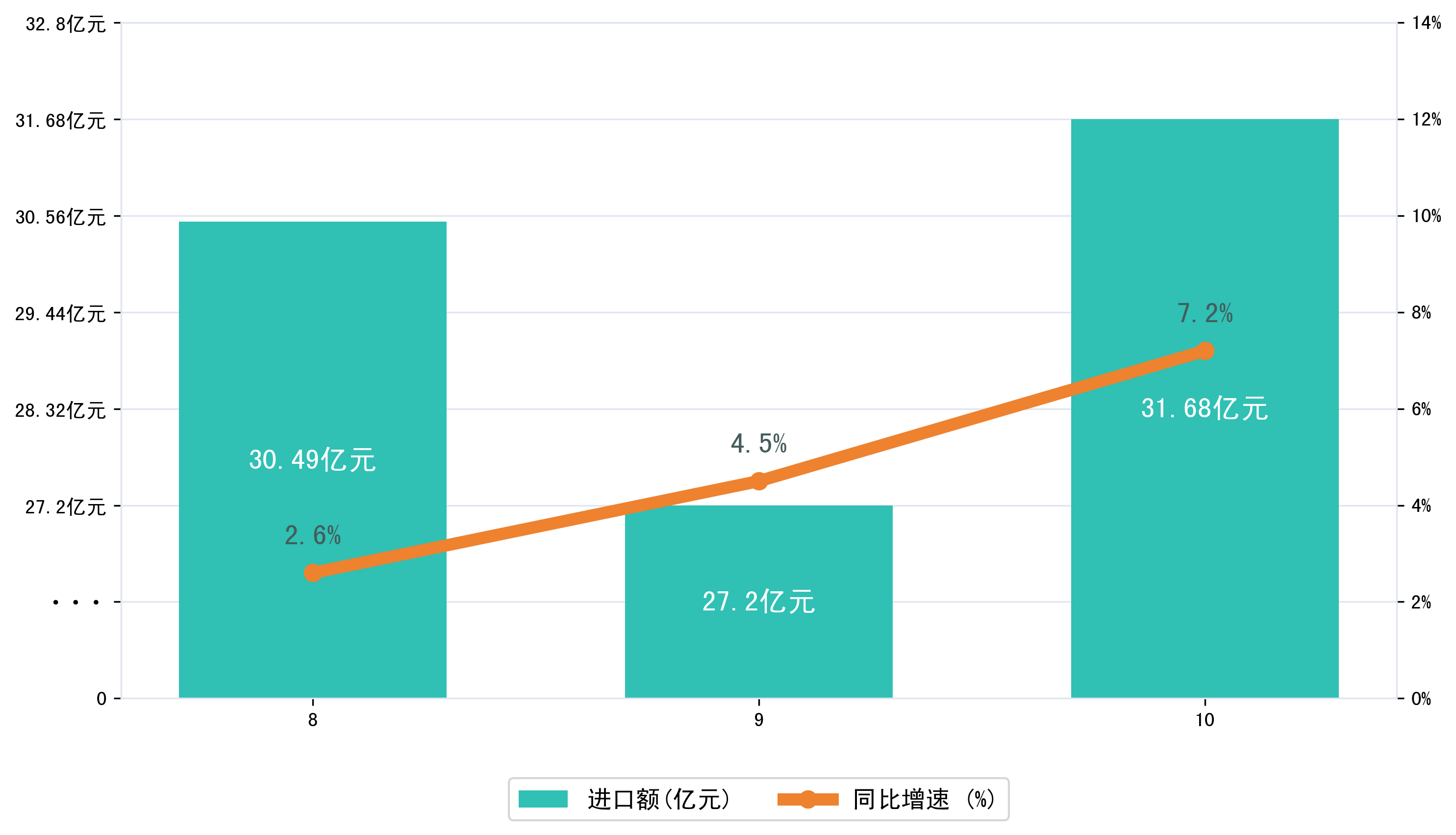 以人民币计,2025年10月湛江市进口额为31,6801.6032万元,相比上月增加了4,4807.6051万元;相比上年同期增加了10,2797.3341万元,同比增加了7.20%。