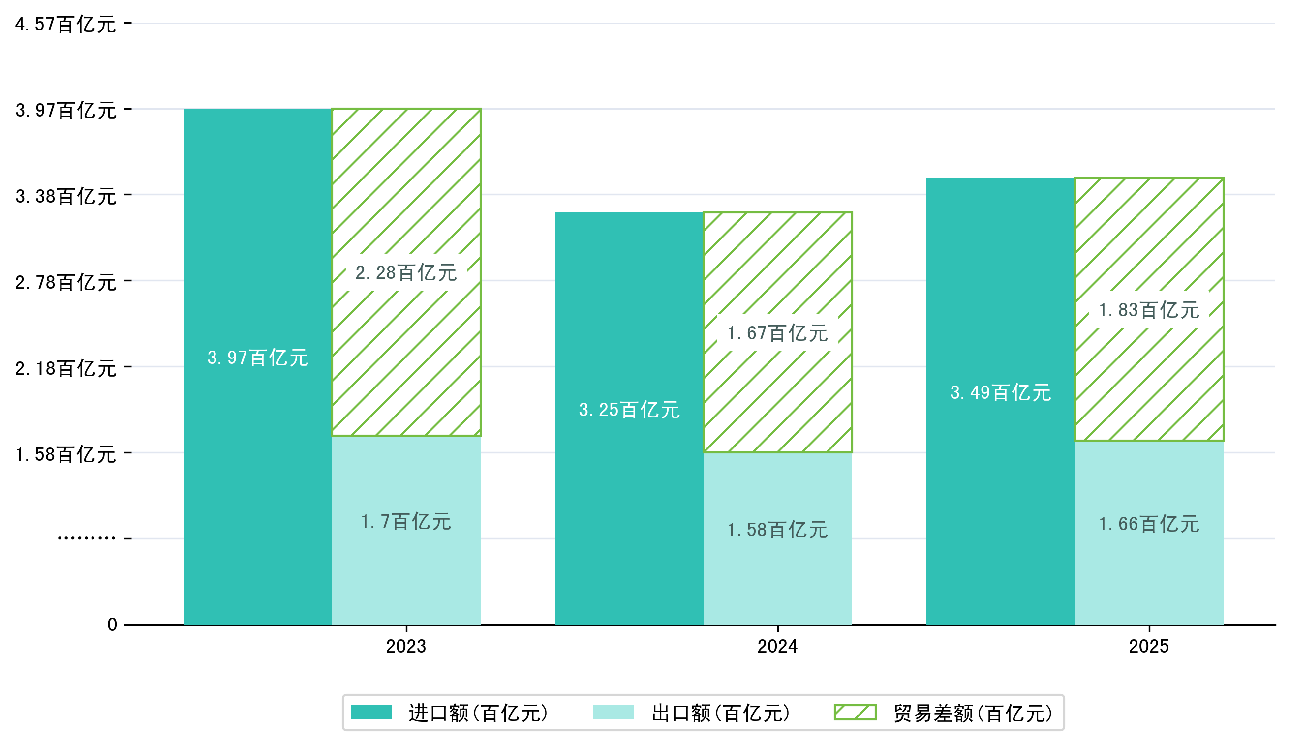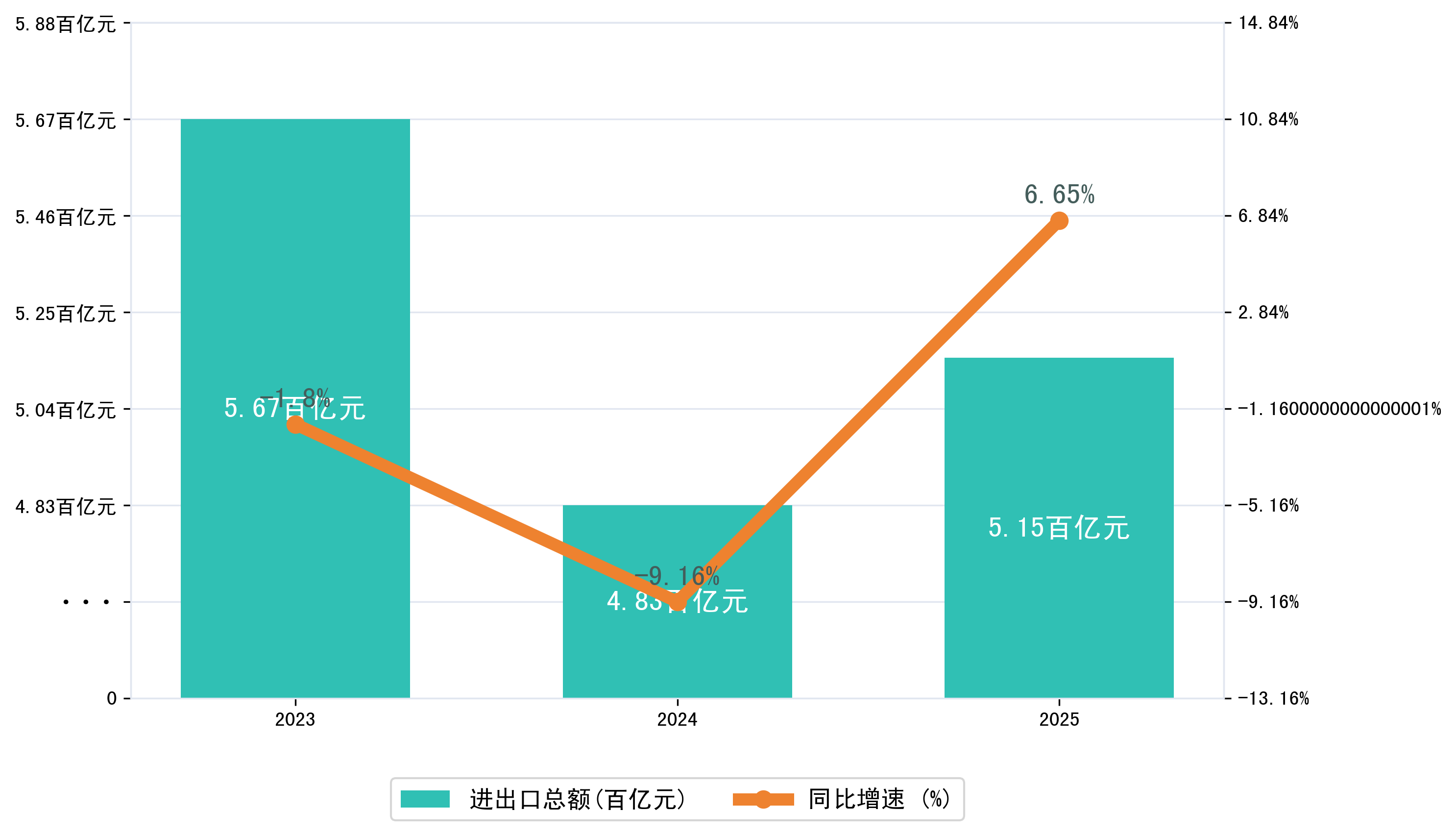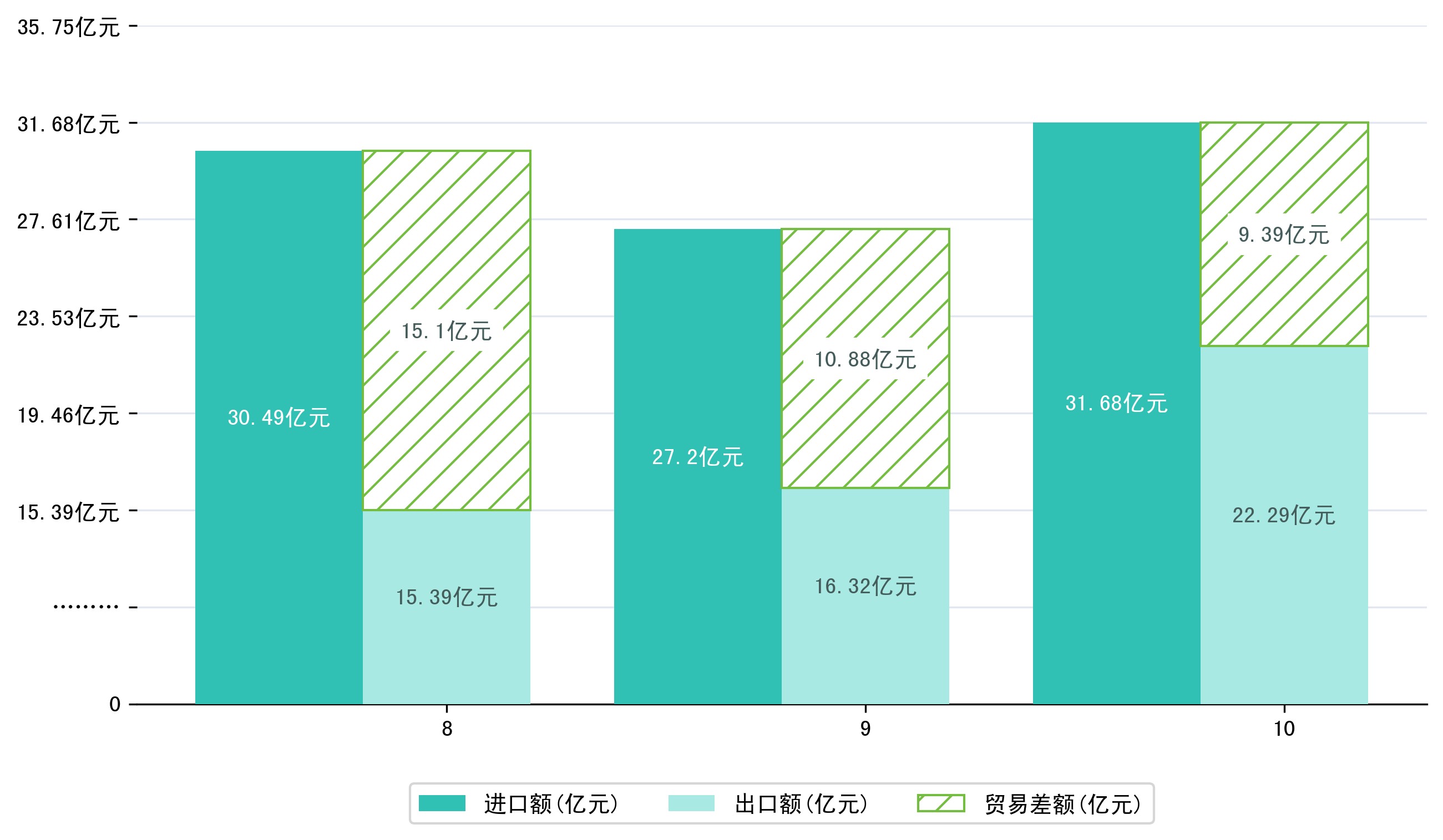 以人民币计,2025年10月湛江市贸易差额为9,3943,5522万元(贸易逆差),相比上月增加了1,4885,2856万元,即2044,4612万美元;相比上年同期减少了5,8305,9825万元,同比减少163.61%。