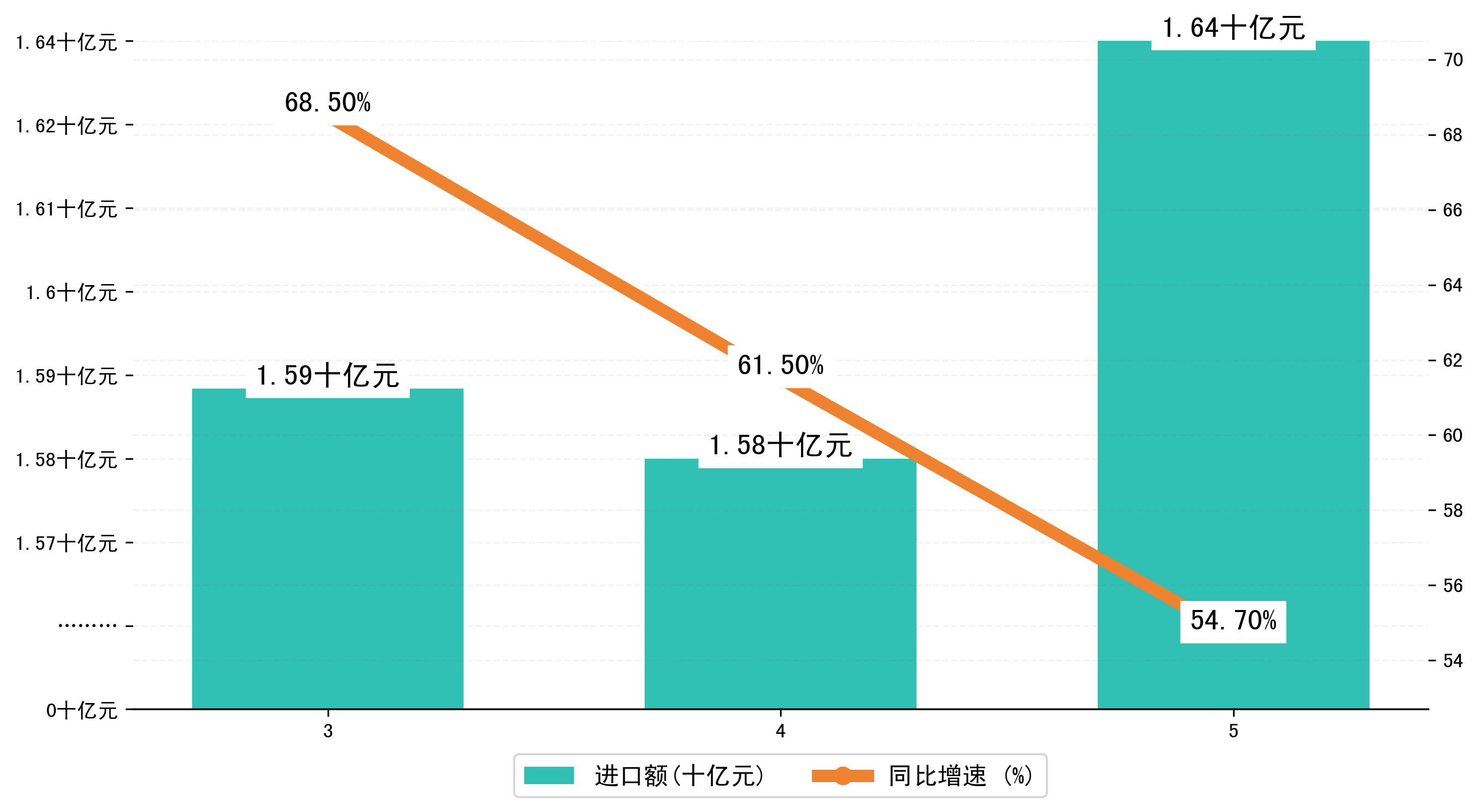 以人民币计,2023年5月包头市进口额为16,3534.2563万元,相比上月增加了5684.1788万元;相比上年同期增加了3,7195.8001万元,同比增加了54.70%。